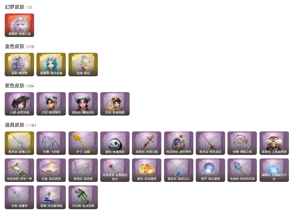 装备描述:红皮1;金皮3;紫皮4;道具皮22;皮肤:薇薇安-沧海之遗,逍遥-剑仙,薇薇安-海月息潮,莉莉-瑶台梦,艾伦-黎明猎手,小黄-异色序曲,阿念-庆宴绮愿,爱丽丝-耀眼的你;道具:桃木剑-寂潮之刃,黄牛能量饮料-无人岸,摸金符-海洋之心,长鞭-缚誓之锁,腰包-惊魂娃娃,音响-月光奏鸣曲,除颤仪-冰晶般的代价,腰包-红运福虎,折扇-赴此良宵,夜视仪-敛花容,铲子-龙鳞,专业手电-花束般的告白,闪光弹-金戈玄铜,传送按钮-逆时审判,长枪-波塞冬,急救包-土拨鼠捏捏,传送按钮-浮生一梦,桃木剑-绯色遗证,葫芦-海心凝珠,长鞭-飞天绫,急救包-末章心跳,电击枪-权杖的许诺;美妆:美妆-听潮祝福;饰品:头饰-蒜了八,头饰-面具马头套,头饰-萨卡班甲鱼头套,头饰-滑稽头套,头饰-鱼头怪头套,头饰-哈士奇头套,头饰-烈焰红唇头套,头饰-呆滞头套,头饰-马上有钱,头饰-精致露比头套,头饰-饺饺者头套,头饰-卑微头套,头饰-纪念,头饰-嘻嘻头套,头饰-像素朋克墨镜,头饰-后室幸存者头套,挂饰-晚安小熊,挂饰-孤独对望,挂饰-桂冠聆诗,挂饰-糖果守卫,挂饰-尘封旧事,挂饰-拂云仙,背饰-子夜证词,背饰-牛