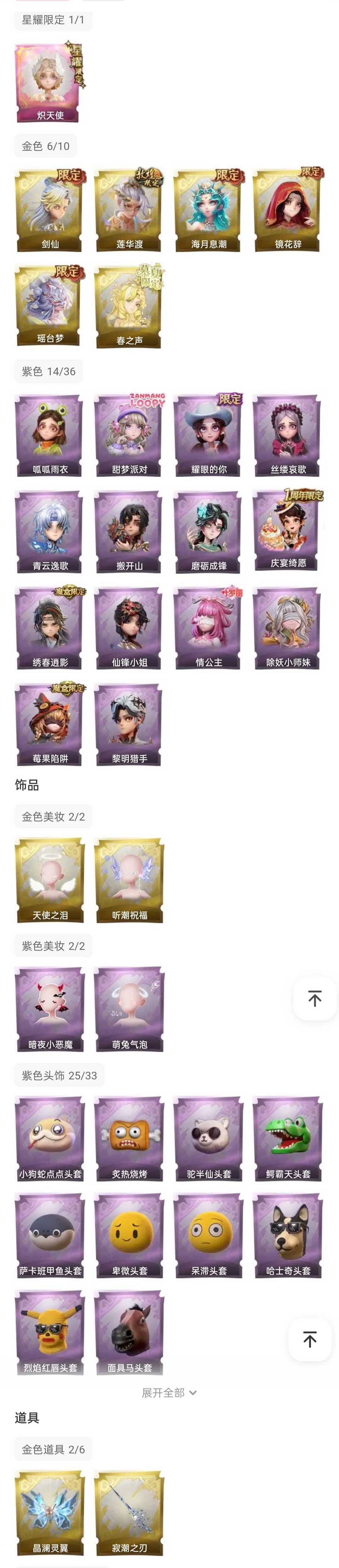 装备描述:累充】47780金砖 【赛季魔盒】普通魔盒 【员工】薇薇安、巫铃儿、莉莉、艾伦、爱德华、兰、小满、临云、小黄、爱丽丝、零、阿念、逍遥、薇薇安、巫铃儿、莉莉、艾伦、爱德华、兰、小满、临云、小黄、爱丽丝、零、阿念、逍遥 【幻梦皮肤】薇薇安-沧海之遗 【星耀限定皮肤】小黄-炽天使 【金色皮肤】逍遥-剑仙、小黄-炽天使、兰-春之声、薇薇安-海月息潮、莉莉-瑶台梦、逍遥-莲华渡、巫铃儿-镜花辞 【紫色皮肤】艾伦-黎明猎手、零-磨砺成锋、阿念-庆宴绮愿、爱丽丝-耀眼的你、零-搬开山、薇薇安-仙锋小姐、爱丽丝-甜梦派对、莉莉-莓果陷阱、莉莉-除妖小师妹、莉莉-情公主、零-青云逸歌、爱丽丝-丝缕哀歌、逍遥-绣春逍影、小黄-呱呱雨衣 【道具皮肤】喷气背包-晶澜灵翼、腰包-宝剑八、急救包-土拨鼠捏捏、音响-happy猫、长枪-波塞冬、夜视仪-金丝眼镜、黄牛能量饮料-无人岸、除额仪-冰晶般的代价、长鞭-新春炸响、桃木剑-寂潮之刃、桃木剑-绯色遗证、专业手电-星寂、夜视仪-敛花容、葫芦-海心凝珠、铲子-圣心之泪、音响-冬夜暖忆、额外的背包-飞花令、传送按钮-浮生一梦、长鞭-小狗蛇点点鞭、长鞭-缚誓之锁、音响-
