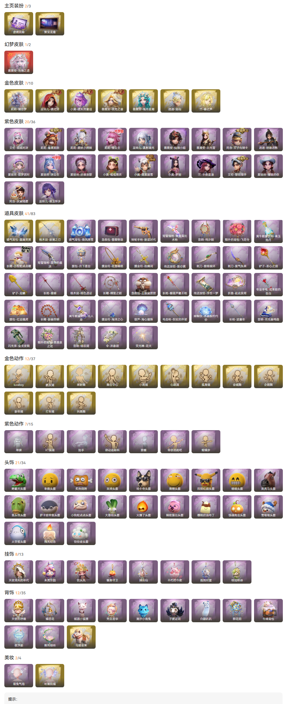 装备描述:皮肤:薇薇安-沧海之遗,莉莉-瑶台梦,薇薇安-圣光之谕,薇薇安-海月息潮,兰-春之声,小黄-遗失的童话,逍遥-剑仙,巫铃儿-镜花辞,小黄-呱呱雨衣,兰-千夜星谕,莉莉-情公主,爱丽丝-甜梦派对,艾伦-黎明猎手,巫铃儿-琢玉怀乡,阿念-庆宴绮愿,爱丽丝-冰公主,薇薇安-白光莹,艾伦-绒绒对决,薇薇安-仙锋小姐,爱丽丝-耀眼的你,莉莉-除妖小师妹,巫铃儿-素影瑶光,爱丽丝-丝缕哀歌,小黄-罗丽,小黄-霓裳踏雪,阿念-王子与骑士,莉莉-莓果陷阱,逍遥-绣春逍影;道具:喷气背包-晶澜灵翼,桃木剑-寂潮之刃,桃木剑-绯色遗证,刺刀-碧络琅环,电击枪-权杖的许诺,伞-沐春颂,传送按钮-昆仑镜,长枪-罪棘,音响-咏叹调,长鞭-小狗蛇点点鞭,刺刀-紫气东来,音响-鸣沙鼓,长枪-糖葫芦霸王枪,铲子-龙鳞,黄牛能量饮料-无人岸,急救包-土拨鼠捏捏,额外的背包-飞花令,腰包-月下莲台,闪光弹-金戈玄铜,荧光棒-花火-荧光棒-花火,额外的背包-灵感泉之花,专业手电-花束般的告白,摸金符-花落精绝,转轮手枪-新星时代,折扇-赴此良宵,长鞭-新春炸响,腰包-红运福虎,葫芦-海心凝珠,黄牛能量饮料-青玉抱丹,除颤仪
