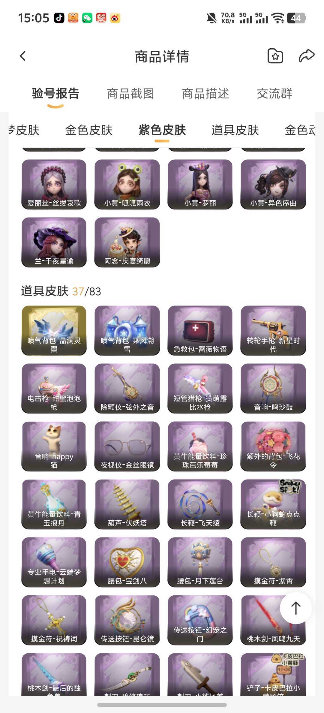 装备描述:红皮1;金皮5;紫皮18;道具皮37;皮肤:巫铃儿-镜生遗梦,零-渡鸦公爵,薇薇安-圣光之谕,巫铃儿-镜花辞,逍遥-莲华渡,小黄-遗失的童话,小黄-呱呱雨衣,兰-千夜星谕,零-青云逸歌,零-搬开山,爱丽丝-冰公主,爱丽丝-丝缕哀歌,莉莉-除妖小师妹,逍遥-绣春逍影,莉莉-情公主,小黄-罗丽,爱丽丝-甜梦派对,巫铃儿-素影瑶光,小黄-异色序曲,莉莉-莓果陷阱,阿念-庆宴绮愿,薇薇安-仙锋小姐,薇薇安-白光莹,艾伦-绒绒对决;道具:喷气背包-晶澜灵翼,摸金符-紫霄,铲子-赞萌波板糖,黄牛能量饮料-青玉抱丹,刺刀-小鲨匕首,长鞭-小狗蛇点点鞭,铲子-卡皮巴拉小黄豚铲,长鞭-飞天绫,桃木剑-最后的独角兽,传送按钮-逆时审判,黄牛能量饮料-珍珠芭乐莓莓,音响-happy猫,音响-鸣沙鼓,刺刀-碧络琅环,铲子-圣心之泪,急救包-土拨鼠捏捏,桃木剑-凤鸣九天,腰包-宝剑八,急救包-蔷薇物语,夜视仪-金丝眼镜,葫芦-伏妖塔,短管猎枪-赞萌露比水枪,喷气背包-乘风溯雪,专业手电-云端梦想计划,铲子-龙鳞,转轮手枪-新星时代,额外的背包-飞花令,刺刀-铂刺与红萼,除颤仪-弦外之音,闪