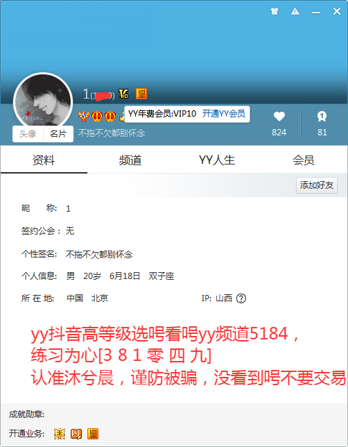 玩YY抖音高等级选呺上呺到yy频道5184,谨防被骗,练习胃鑫[3 8 1 零 四 九]