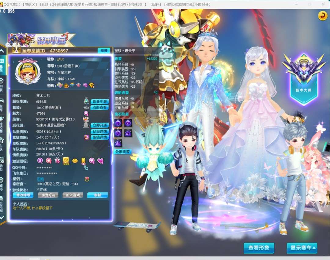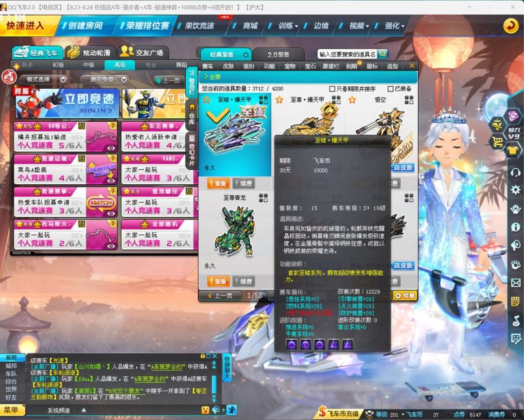 装备描述:钻7 至臻爆天甲三颗四级 改装29 至尊爆天甲双四级宝石 6辆永久S车 斗战胜佛 S黄金追魂 风怒 炼狱之刃 2辆T2悟空 五级皮肤 铁甲巨龙 T1 朱雀 至尊青龙 战魂 噬魂金甲 多辆永久A 雷诺 针尖 最强竞速宠 游鸿蓝鲸强化10 齐天大圣强化10 子鼠 艾丽莎强化10 飞碟改装全29四级宝石 如果冻结 请重新登录