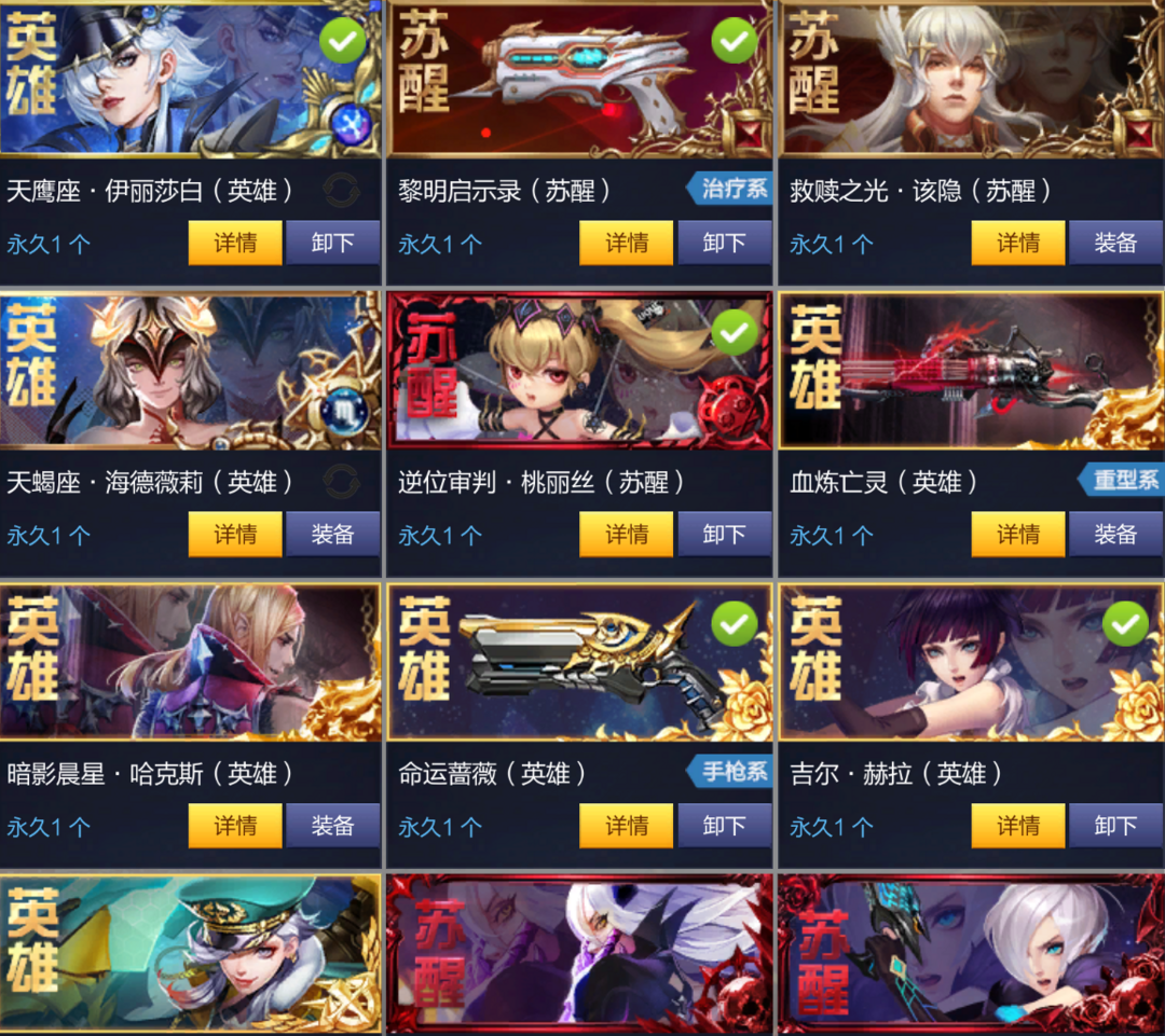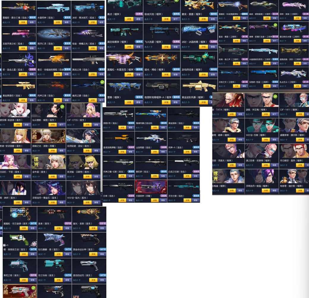 装备描述:天鹰座。天蝎狙,星河珊灵。古堡刀,推理社火,古堡火,摩羯座火,宝石火,探险家洁西卡,火印骑士塞蕾娜,婚纱猴,哈克斯,朱利安,赤狐福斯剑鱼劳伦斯金牛座奶仙云堕落影奶婉雪,幽夜工,异种工,龙年工,绿喇叭,夏日快乐水锤,异种工,苍蓝工,乱丛生云,极夜榴,凝光榴,凝光奶,觉醒奶61锤,铂金狙,冰封狙,兽王狙,亡灵狙,死准狙,洞明狙,水晶死神,山连绝壁,奥丁长矛,死神银炮,凝光导,零点导,龙年导,金炮,极光导,兽王导,星间飞行蓝胖子,虚空之冥,苍蓝导,零点机,天命机,曜夜强袭,水晶机,二哈,兽王机,鬼玉,天命猴,呲水枪,炽焰巨浪,龙年火,铂金火,苍蓝火,水晶刀,蒸汽刀,