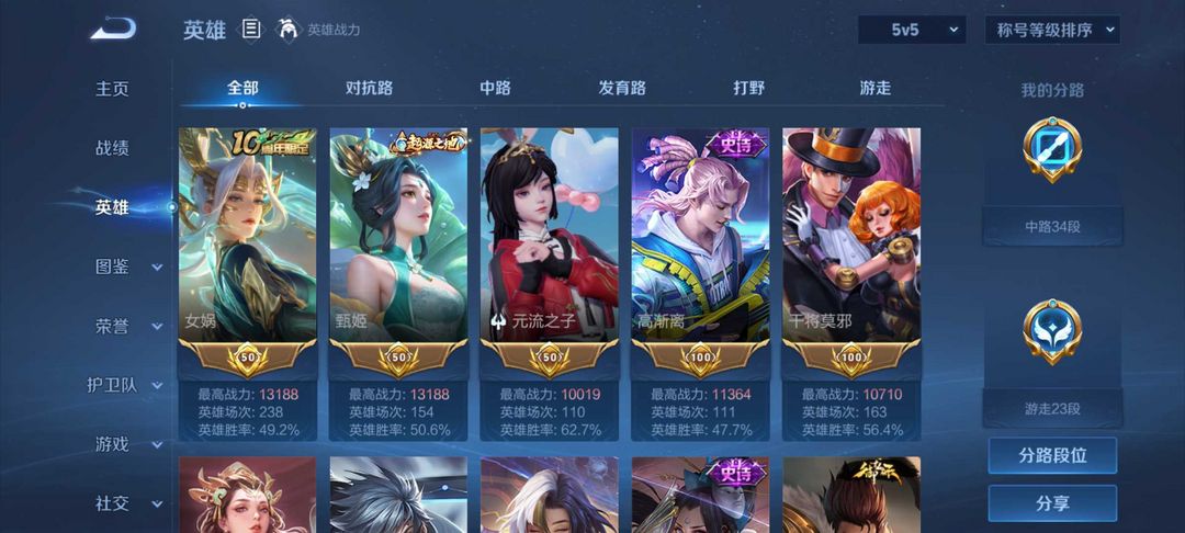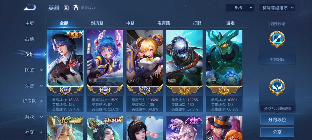 巅峰前10%中路⭐在榜三金标扁鹊孙膑高渐离⭐超多限定皮肤 历史三小国周瑜小乔孙膑 可排位禁巅峰