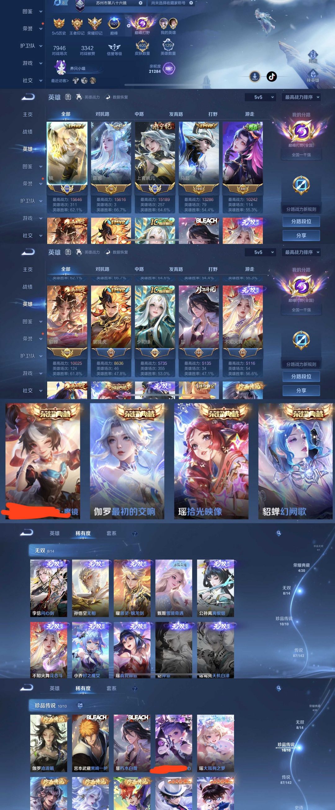 限制: 租号2次及以上 |装备描述:时间到了还登录白玩或者顶号全部改密拉黑处理永不解除,顶号机器会秒禁玩改密,顶号不仅拉黑还没得玩,赚三两块不容易,请理解谢谢。 ❤❤❤❤❤❤❤❤❤❤❤❤ 请勿开挂,挂机,送头,骂人,撤单后游戏等如有违规永久拉黑永不解除。 重置二级密码不要费劲了,号主每天都会上号查看,多行不义必自毙,人在做天在看,多做好事多自律,少做缺德事 该号英雄129个皮肤405个,典藏4个,无双8个,珍品传说10个,星传说10个,传说87个,史诗139个,祝你游戏愉快~