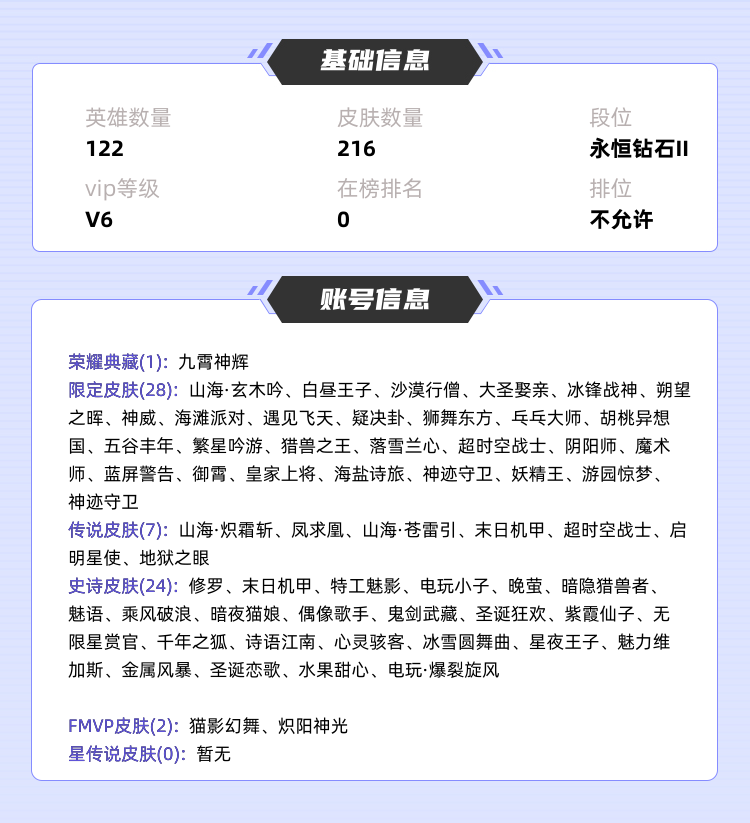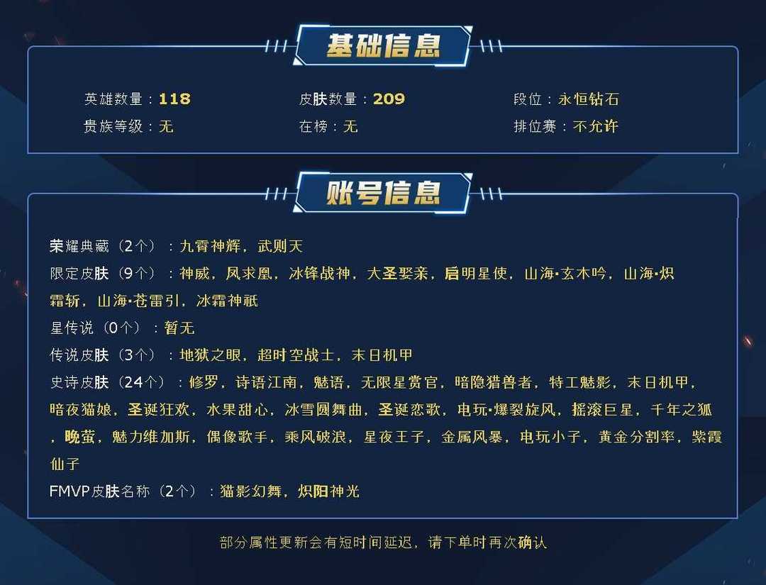 装备描述:>>>>>>毁号,涉及毁坏虚拟财产罪及计算机安全罪,请文明游戏素质游戏,让我们共建美好租号平台>>>>>> 本游戏账号: V8用户,基础段位:永恒钻石V,英雄多,皮肤多。典藏皮肤1个,感受典藏皮肤带来的优质体验快感,FMVP皮肤2个,尽情享受FMVP皮肤带来的主角光环, 私人所属英雄皮肤有:花木兰 九霄神辉曜 山海·苍雷引||虞姬 启明星使||李信 山海·炽霜斩||孙尚香 末日机甲||宫本武藏 地狱之眼||狄仁杰 超时空战士||李白 凤求凰镜 炽阳神光||貂蝉 猫影幻舞,等等 注意事项: A.游戏过程中请不要恶意挂机或者不文明发言;B.恶意挂机、顶号等行为将被拉黑无法再次下单;C.进入游戏后中途请勿退出登陆,否则无法再次上号;D.部分账号由于异地登录可能会出现密码错误提示,通常再尝试5-6次后可上号。 |||||||||>喜欢本账号请点 ☆收藏☆ 方便下次租用,谢谢光临惠顾|||||||||