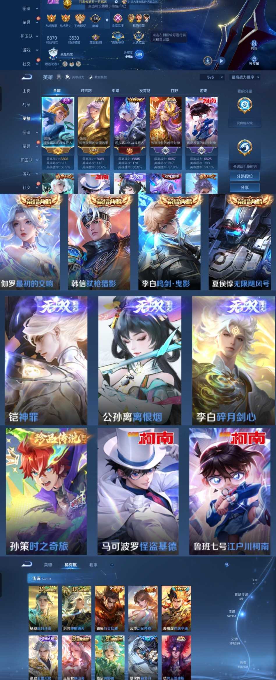 限制: 租号2次及以上 |装备描述:时间到了还登录白玩或者顶号全部改密拉黑处理永不解除,顶号机器会秒禁玩改密,顶号不仅拉黑还没得玩,赚三两块不容易,请理解谢谢。 ??????????????? 请勿开挂,挂机,送头,骂人,撤单后游戏等如有违规永久拉黑永不解除。 重置二级密码不要费劲了,号主每天都会上号查看,多行不义必自毙,人在做天在看,多做好事多自律,少做缺德事。 该号英雄127个皮肤456个,典藏4个,无双3个,珍品传说3个,星传说2个,传说52个,史诗157个,祝你游戏愉快~
