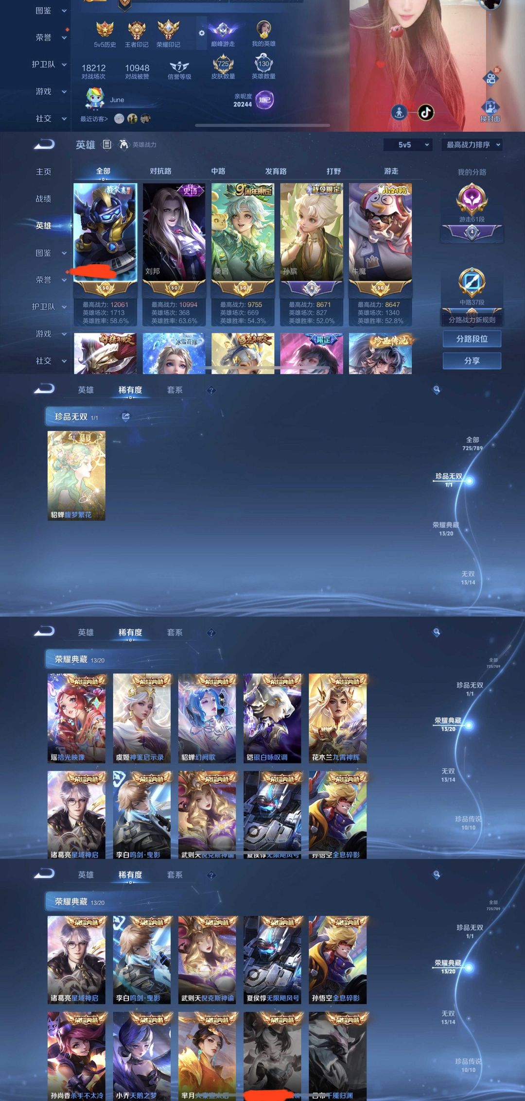 限制: 租号2次及以上 |装备描述:时间到了还登录白玩或者顶号全部改密拉黑处理永不解除,顶号机器会秒禁玩改密,顶号不仅拉黑还没得玩,赚三两块不容易,请理解谢谢。 ❤❤❤❤❤❤❤❤❤❤❤❤ 请勿开挂,挂机,送头,骂人,撤单后游戏等如有违规永久拉黑永不解除。 重置二级密码不要费劲了,号主每天都会上号查看,多行不义必自毙,人在做天在看,多做好事多自律,少做缺德事 该号英雄130个皮肤725个,珍品无双1个,典藏14个,无双13个,珍品传说10个,星传说9个,传说124个,史诗264个,祝您游戏愉快~