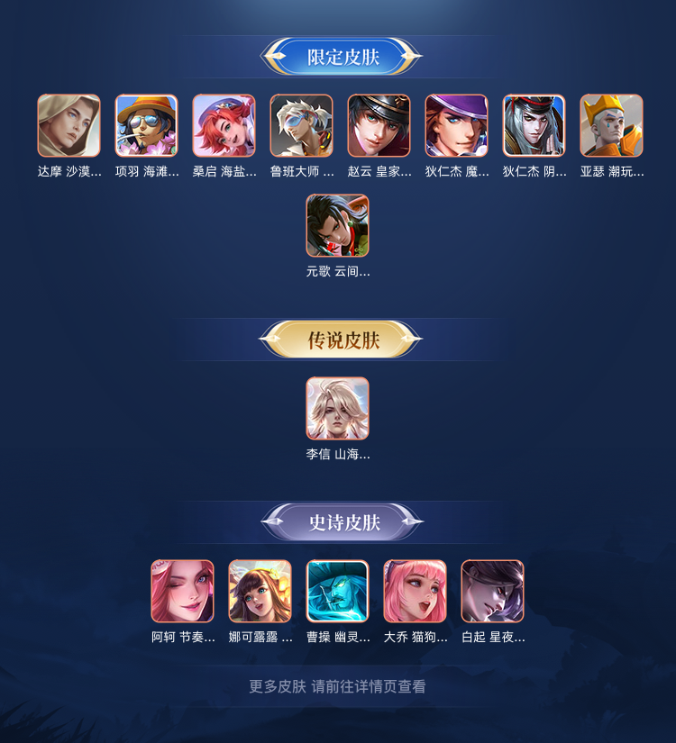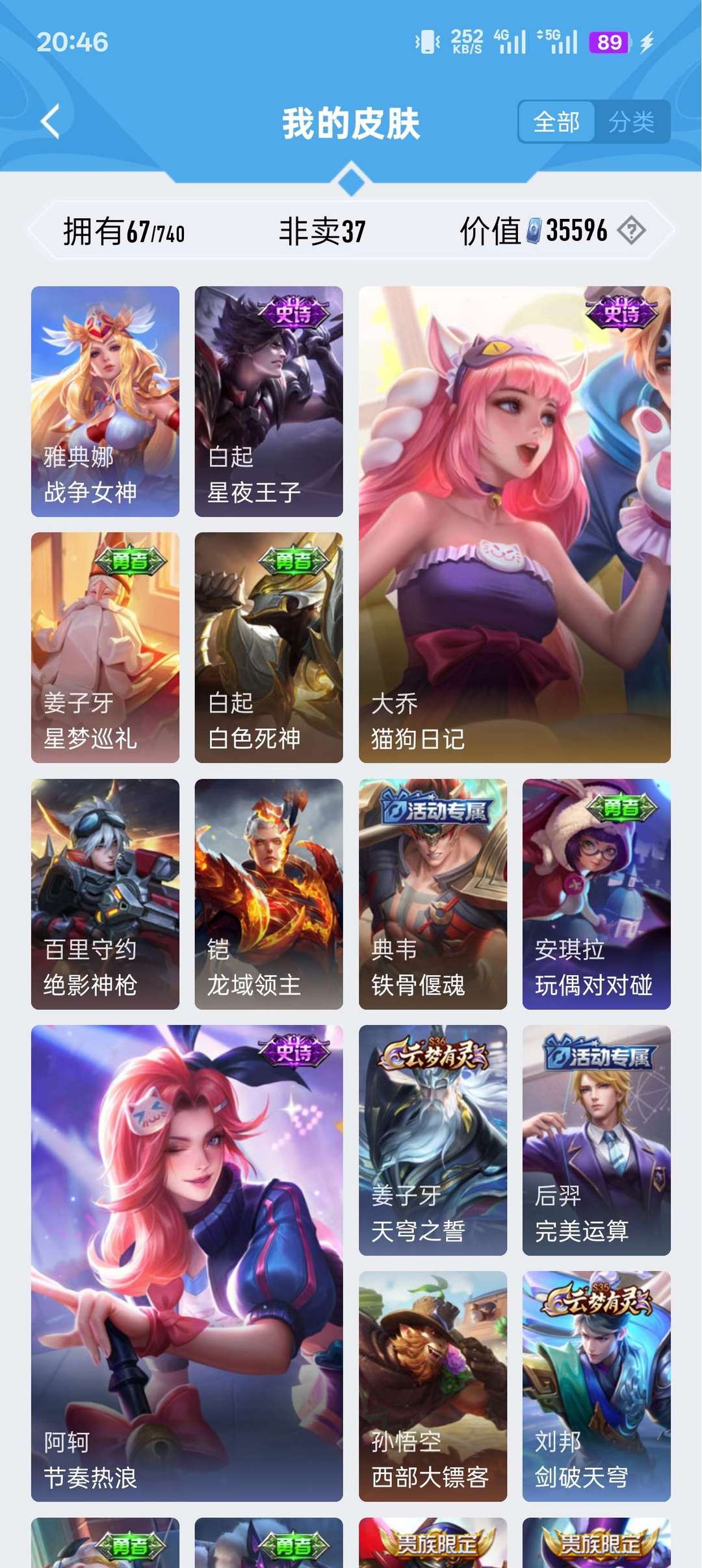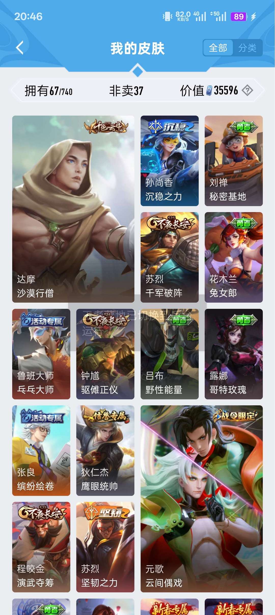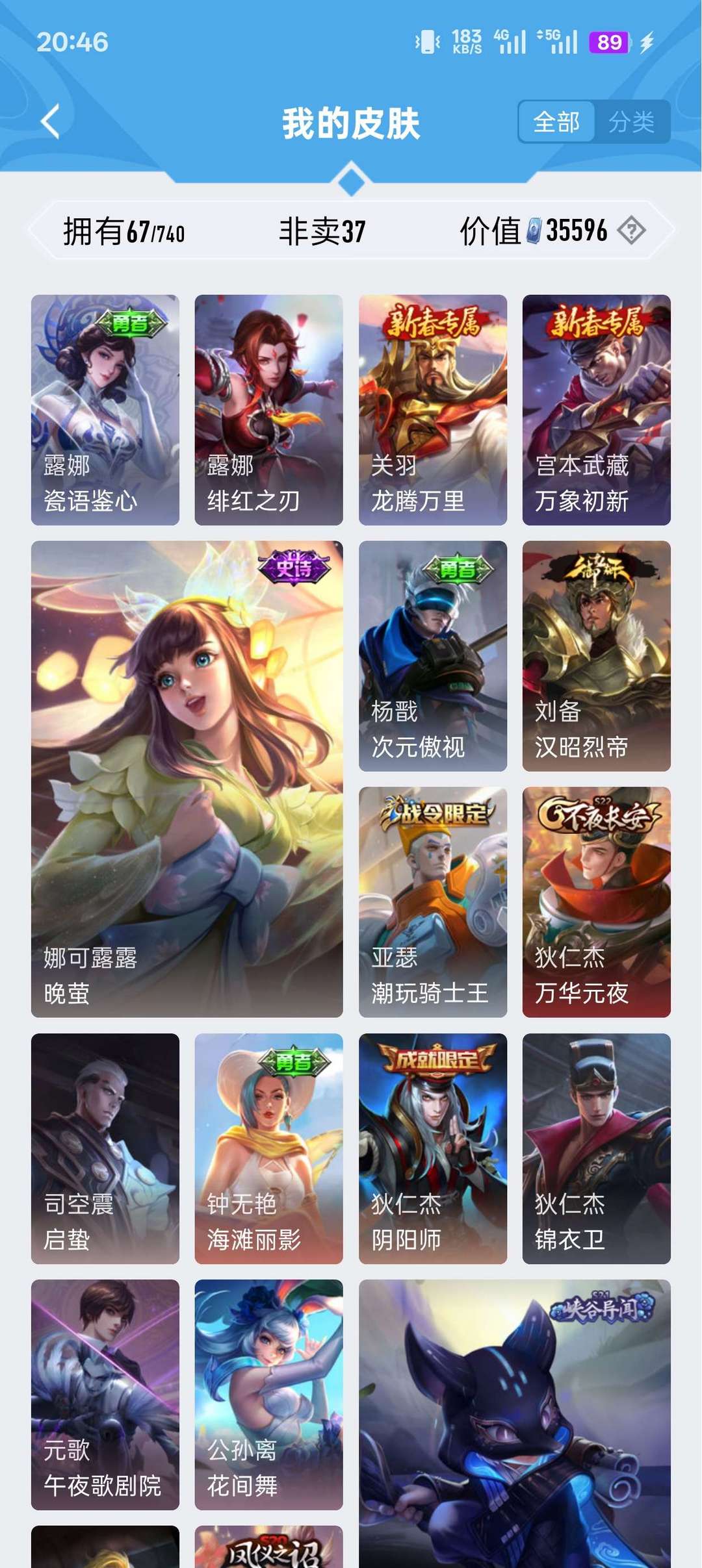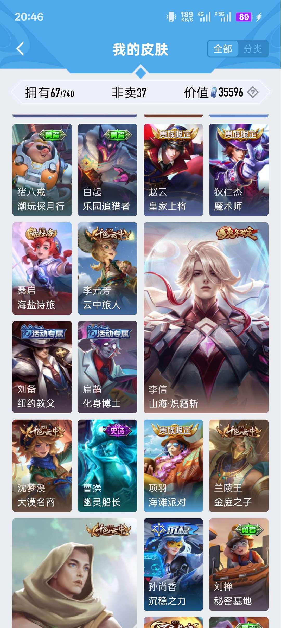 装备描述:有六十七皮肤,一百英雄,两套一百五铭文,有李信年限皮肤