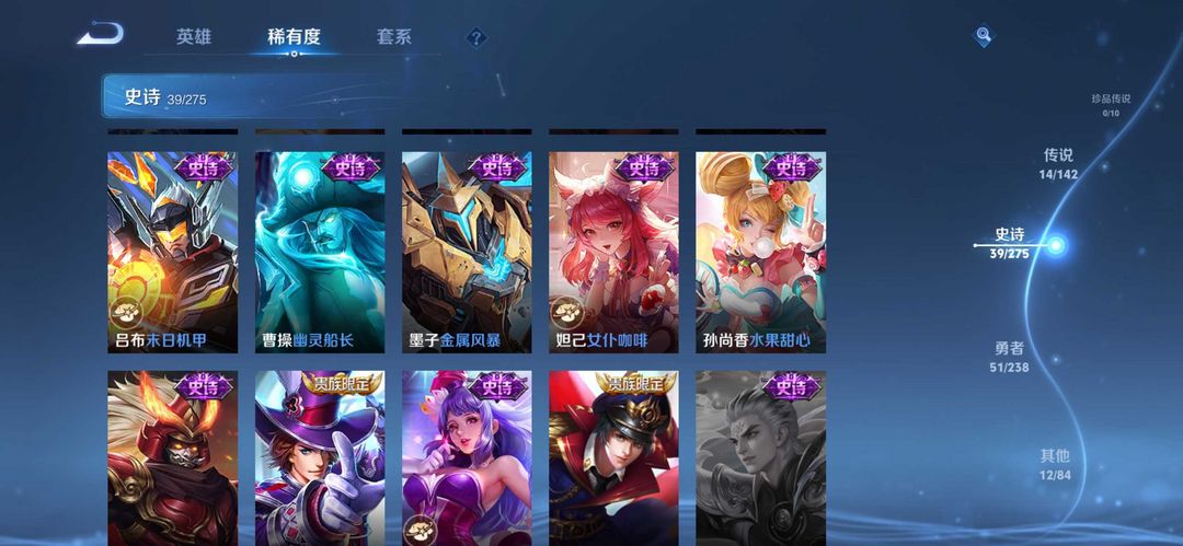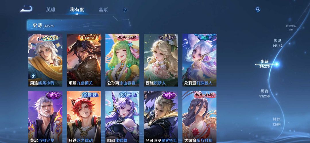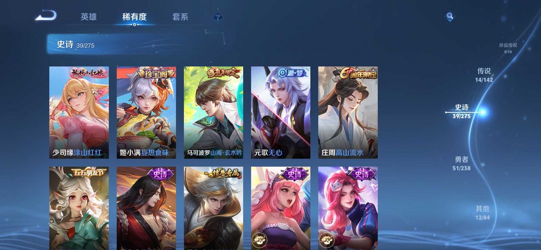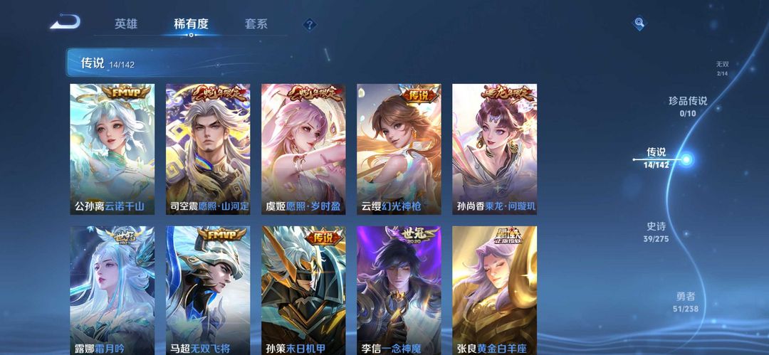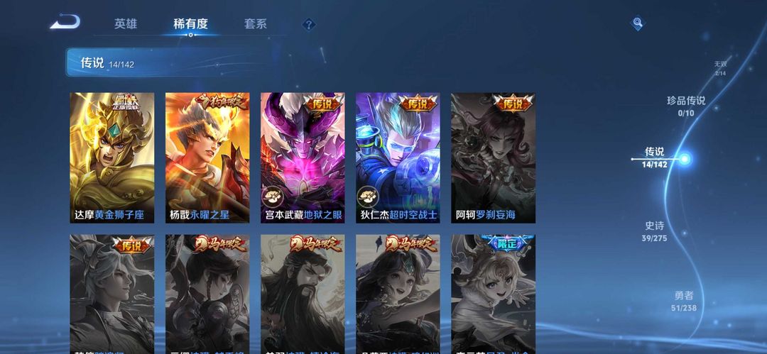 装备描述:公孙离无双离恨烟、小乔无双、大司命东方月初、少司缘涂山红红、孙尚 香龙年、虞姬龙年、杨戬狗年、后羿狗年、宫本地狱 (有万化臭黄香蕉克星)、达摩狮子座、张良白羊 座、一念神魔、大司命和少司缘情皮、朵莉亚限定 (幻珠鲛人