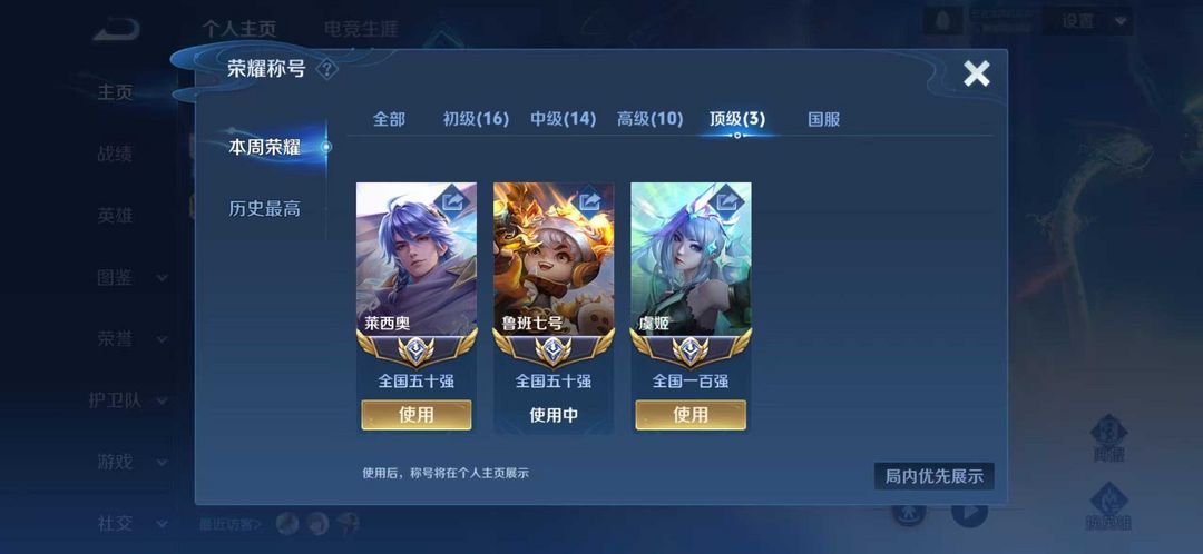 三小国莱西奥鲁班虞姬在榜⭐5省标戈娅艾琳孙尚香狄仁杰公孙离⭐巅峰射手闪电框⭐可排位/禁巅峰/禁挂机