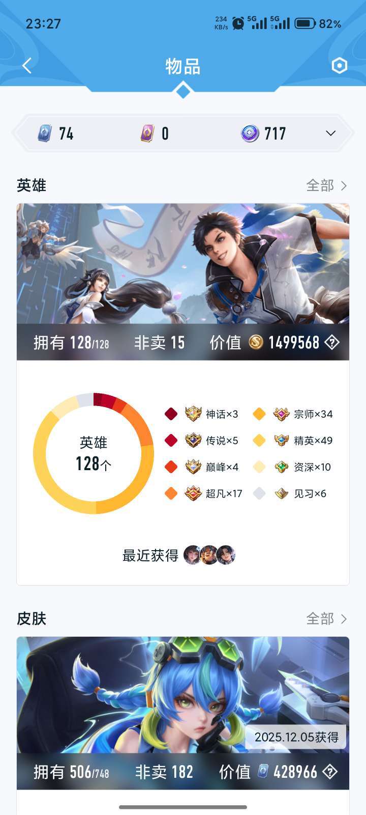 装备描述:铭文都是满级,皮肤几乎每个英雄都有,大家想玩啥看看主页 主页有物品详情