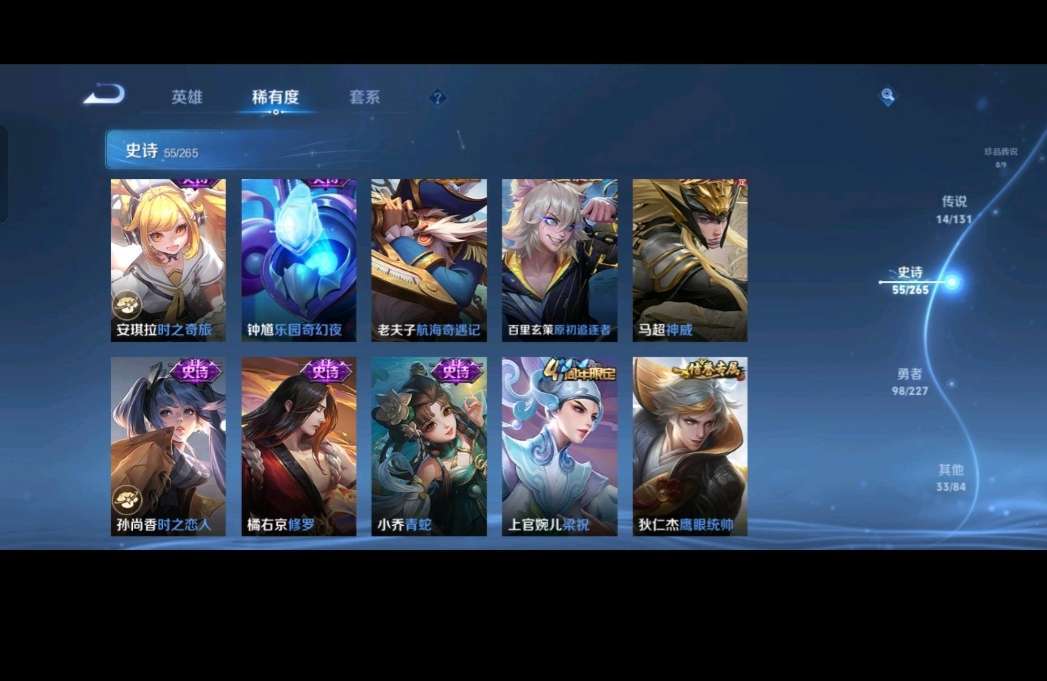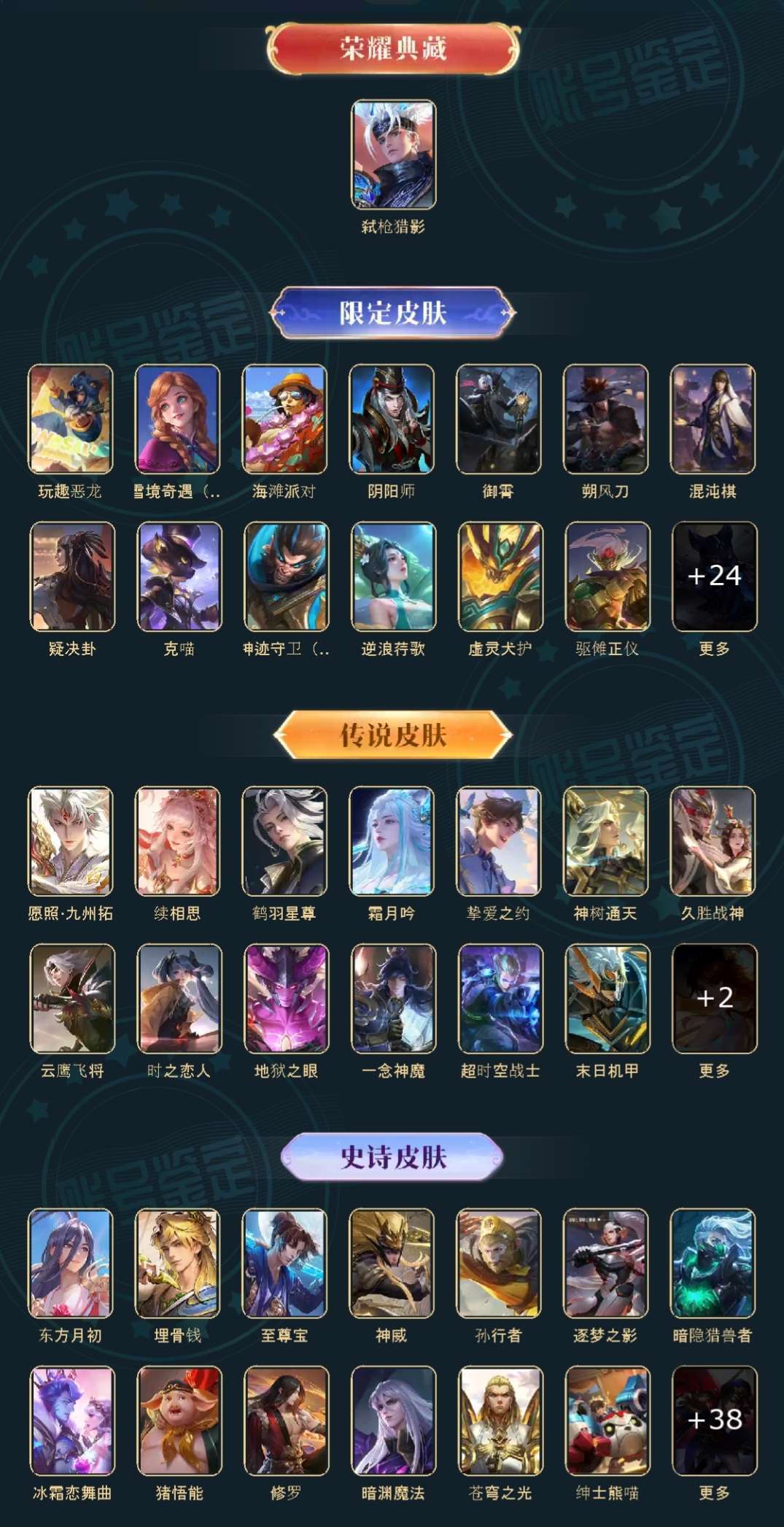 限制: 租号1次及以上 |装备描述:贵族等级V7,段位荣耀王者,英雄数量125,典藏皮肤数1,皮肤数量199,至尊宝/愿照·九州拓/挚爱之约/鹤羽星尊/霜月吟/东方月初/埋骨钱/弑枪猎影/续相思/神威/神树通天/至尊宝/愿照·九州拓/挚爱之约/鹤羽星尊/霜月吟/东方月初/埋骨钱/弑枪猎影/续相思/神威/神树通天