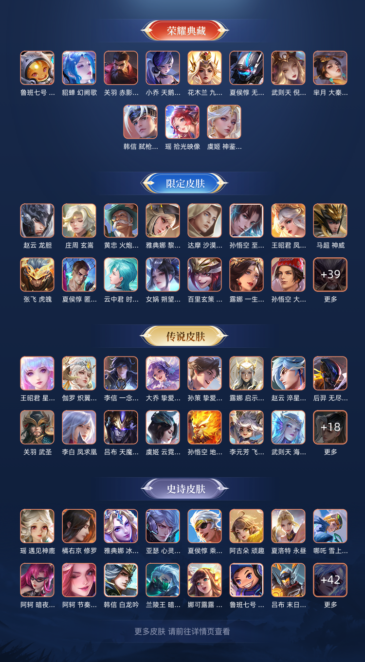 513皮满英雄,满铭文。六无双10典藏,70传说,五珍品传说。还有一个小兵皮肤,5个天幕。