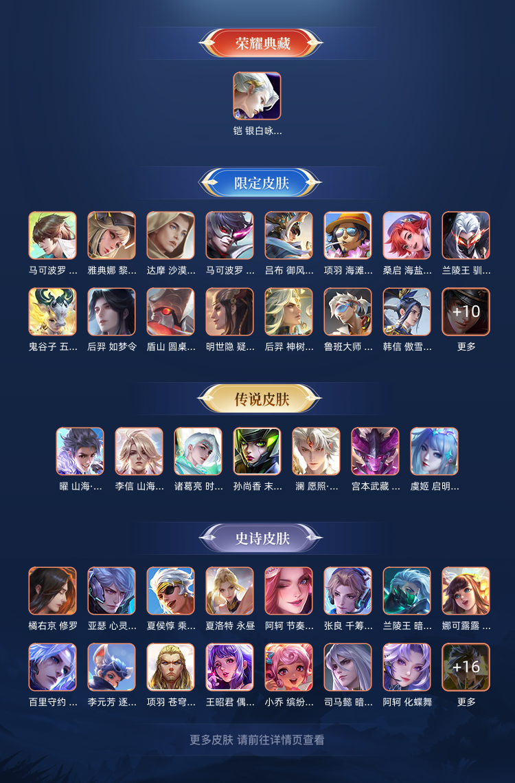 耀无双全皮 凯荣耀典藏 落雪白狼 李信赵云孙尚香澜年限 时雨天司 鹤归松栖多fmvp宫本差一全皮等