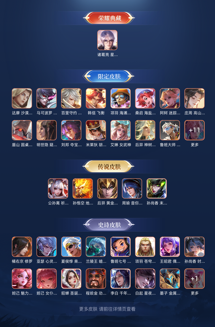 有诸葛亮的荣耀典藏皮肤,以及孙尚香和孙悟空等英雄的传说皮,皮肤不多,但是价格低廉,