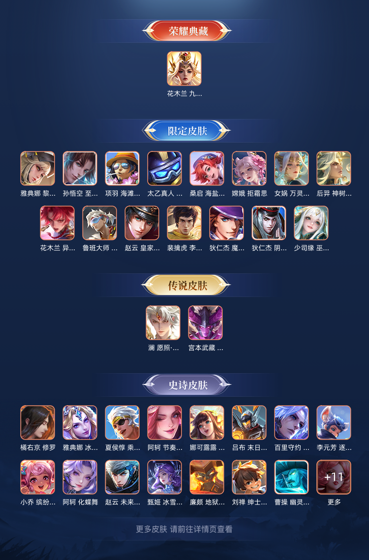 装备描述:英雄:花木兰(花木兰 九霄神辉,花木兰 异界灵契,花木兰 燃星之曲,花木兰 兔女郎,花木兰 剑舞者,花木兰 水晶猎龙者,区标);孙悟空(孙悟空 至尊宝,孙悟空 西部大镖客);雅典娜(雅典娜 战争女神,雅典娜 潮玩士官长,雅典娜 黎明之约,雅典娜 冰冠公主,区标);娜可露露(娜可露露 晚萤,区标);妲己(妲己 线条小狗,妲己 紫罗兰之誓,妲己 女仆咖啡,妲己 灵卜魔法,妲己 魅力维加斯);高渐离(高渐离 落日弦歌,高渐离 燃音魔法,高渐离 金属狂潮);韩信(韩信 教廷特使,韩信 街头霸王);司空震(司空震 地狱燃心,司空震 启蛰);公孙离(公孙离 涂山容容,公孙离 云诺千山,公孙离 花间舞);马超(马超 幸存者);艾琳(艾琳 鹤鸣心笺,艾琳 流音漫舞);露娜(露娜 命运加冕,露娜 霜月吟,露娜 紫霞仙子,露娜 哥特玫瑰,露娜 瓷语鉴心);狂铁(狂铁 命运角斗场,狂铁 龙之律动,狂铁 特工战影);小乔(小乔 线条小狗,小乔 缤纷独角兽);海诺(海诺 时空谍影);貂蝉(貂蝉 圣诞恋歌,貂蝉 长夏之忆,貂蝉 异域舞娘);赵怀真(赵怀真 器灵·浮梦炉);马可波罗(马可波罗 潮玩牛仔,马可波罗 怪
