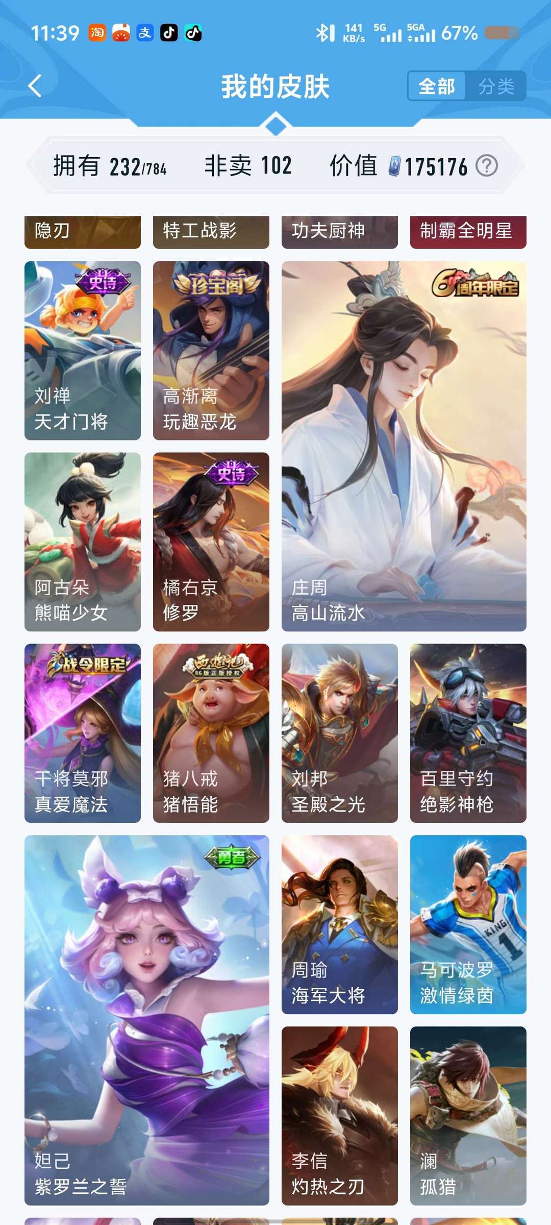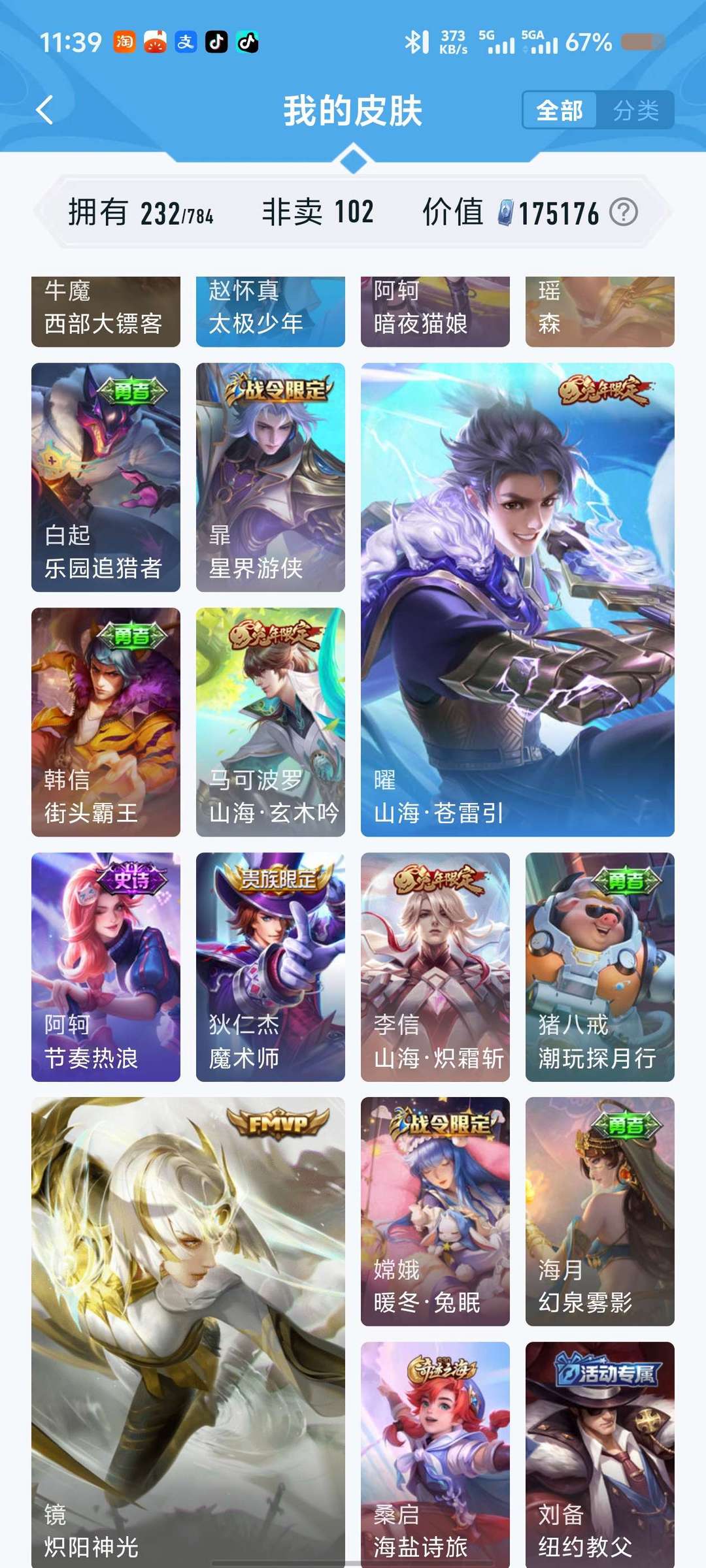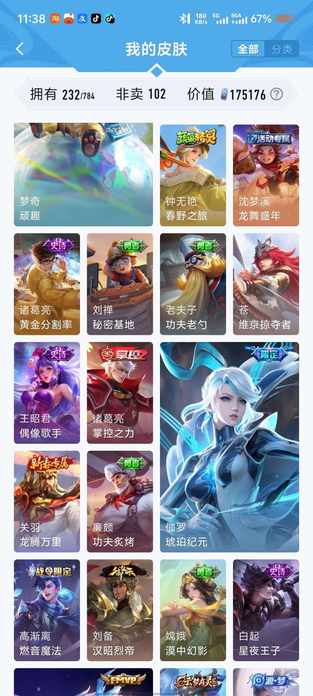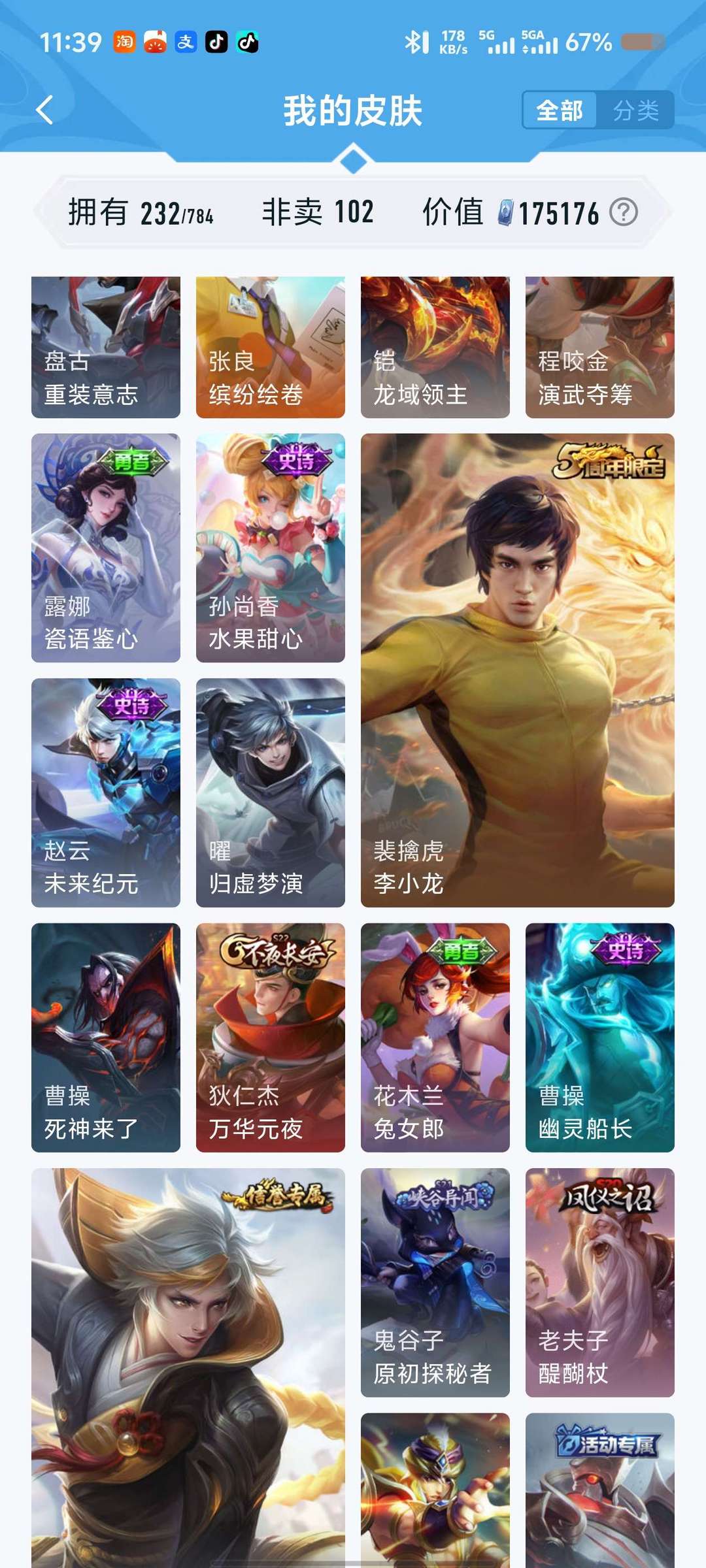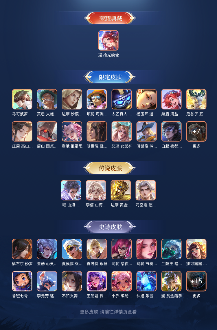 有李小龙等限定皮肤,摇的荣耀典藏,打野射手皮肤还算多,中路边路也还算多,辅助也有