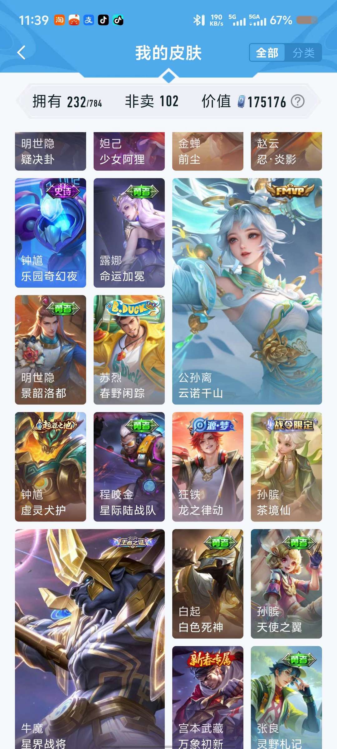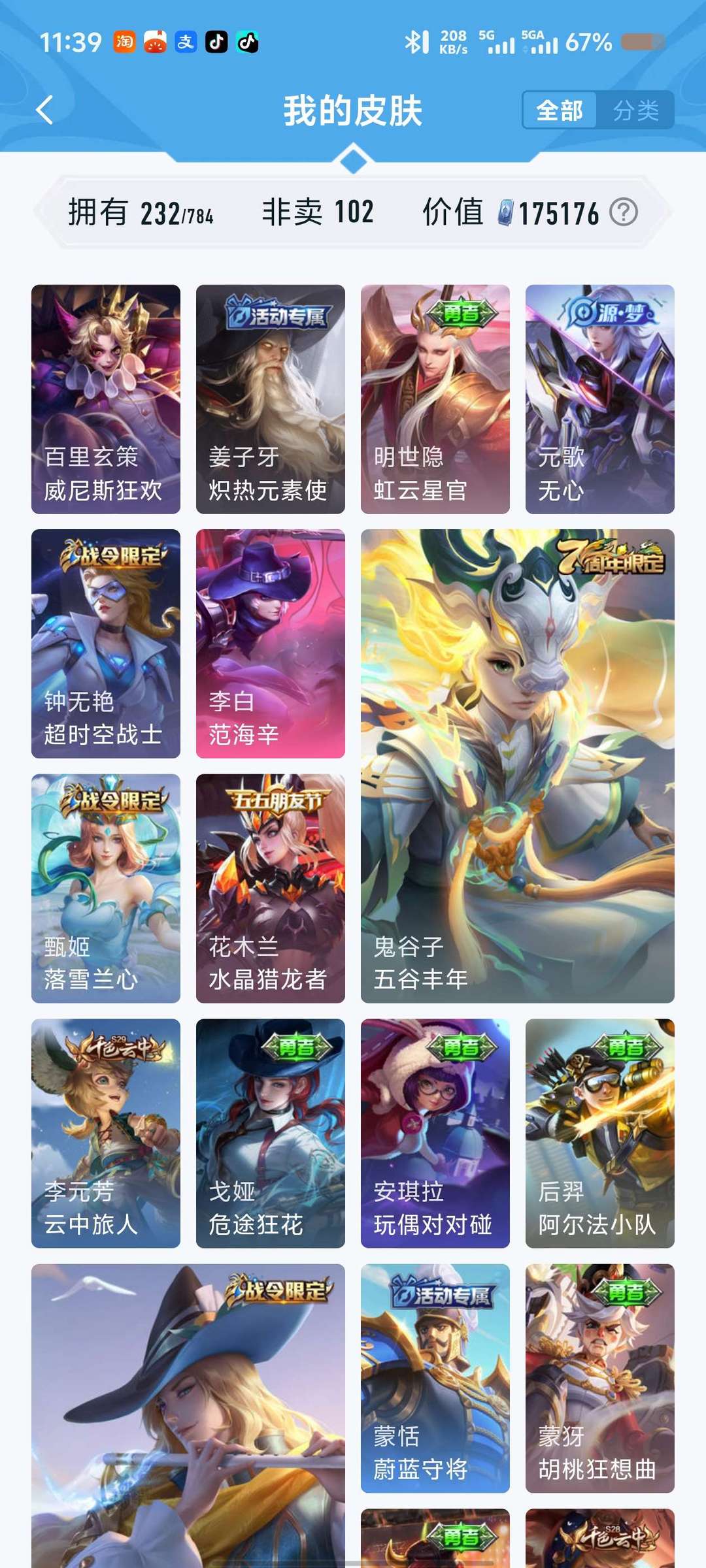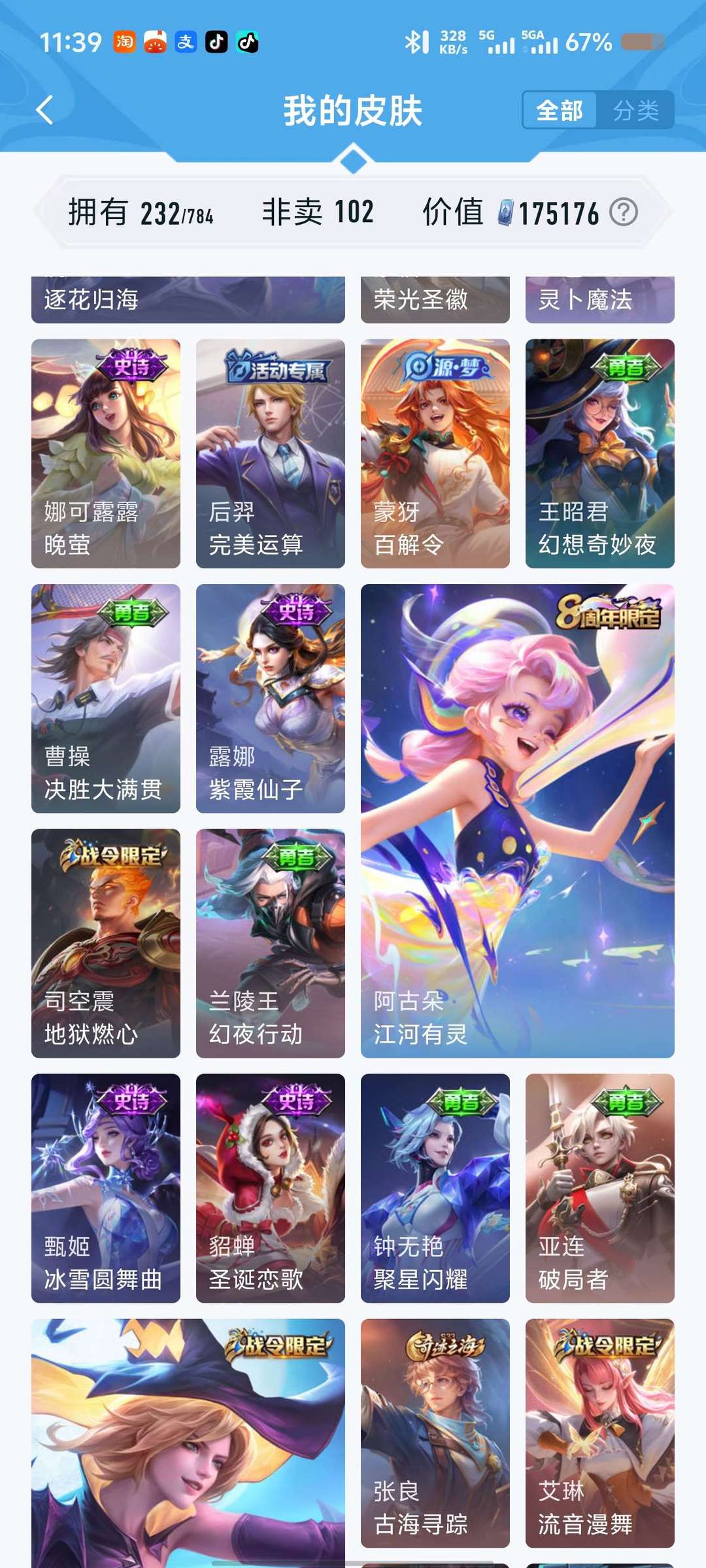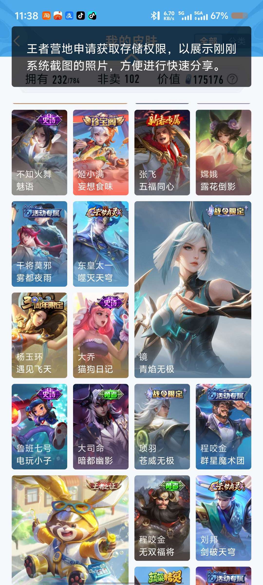 有李小龙等限定皮肤,摇的荣耀典藏,打野射手皮肤还算多,中路边路也还算多,辅助也有