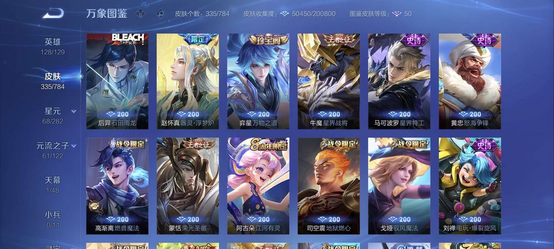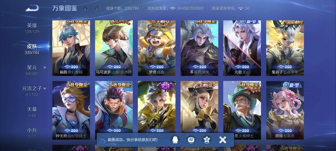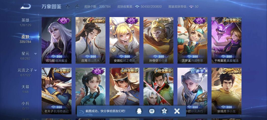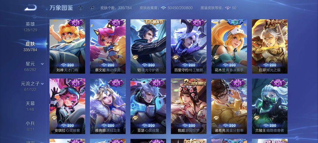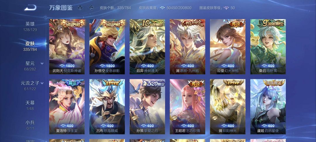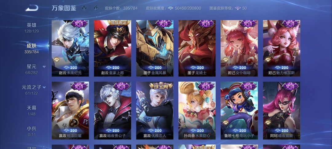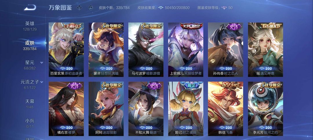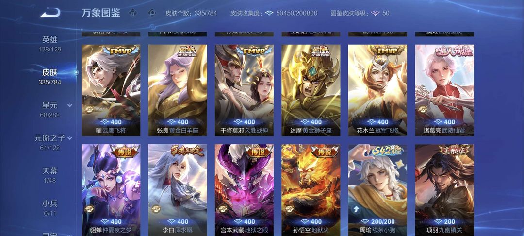铭文全满 全息碎影 尼克斯神域 凤求凰 至尊宝 冠军飞将 黄金狮子座 等二十多款传说皮肤