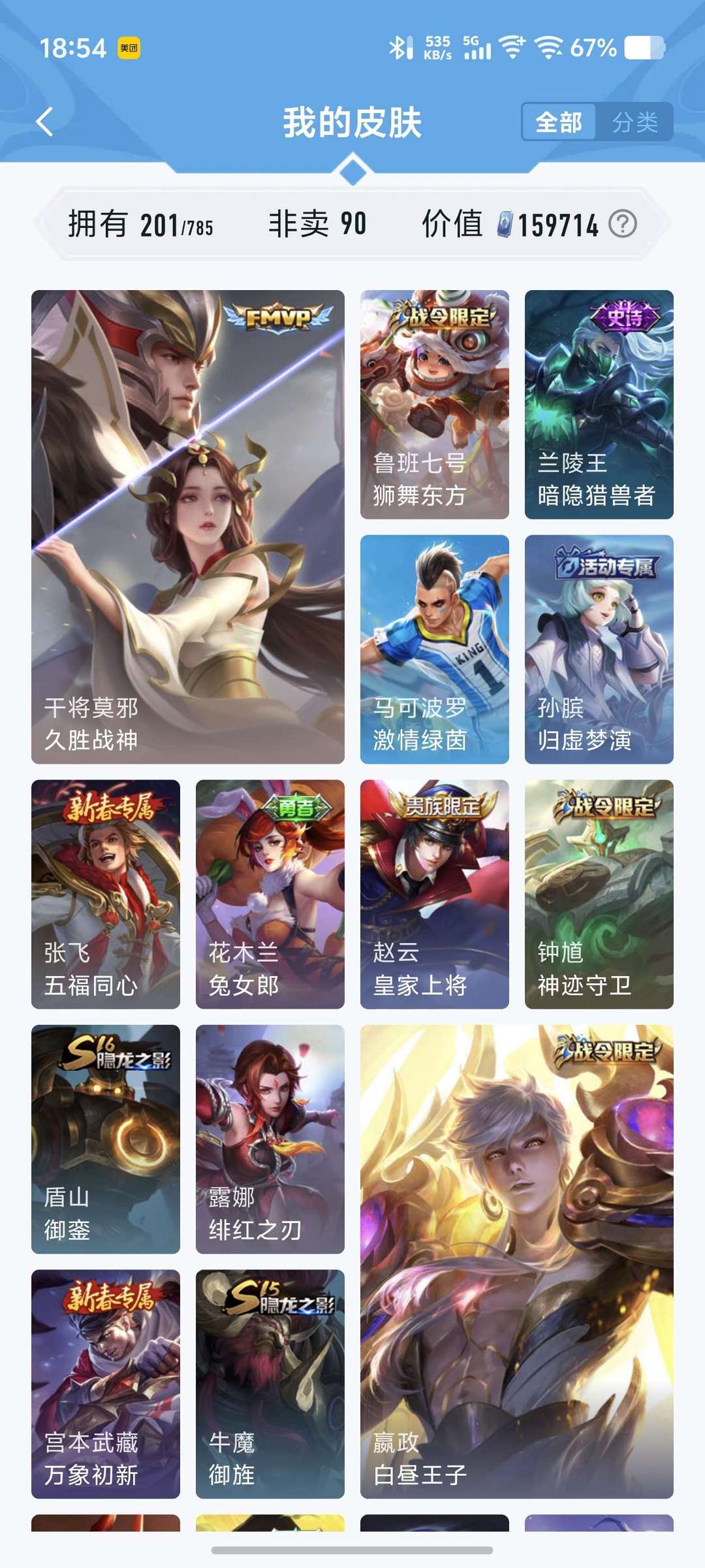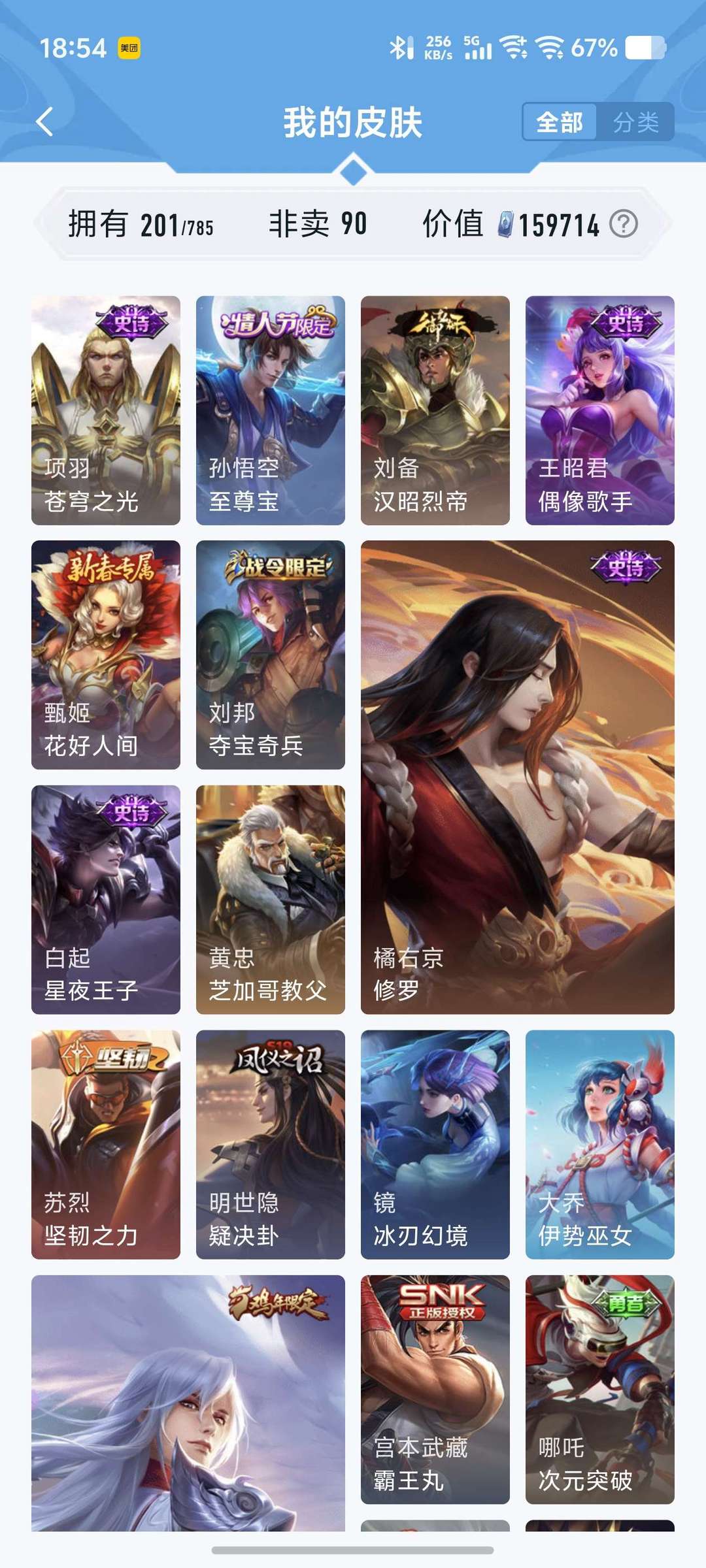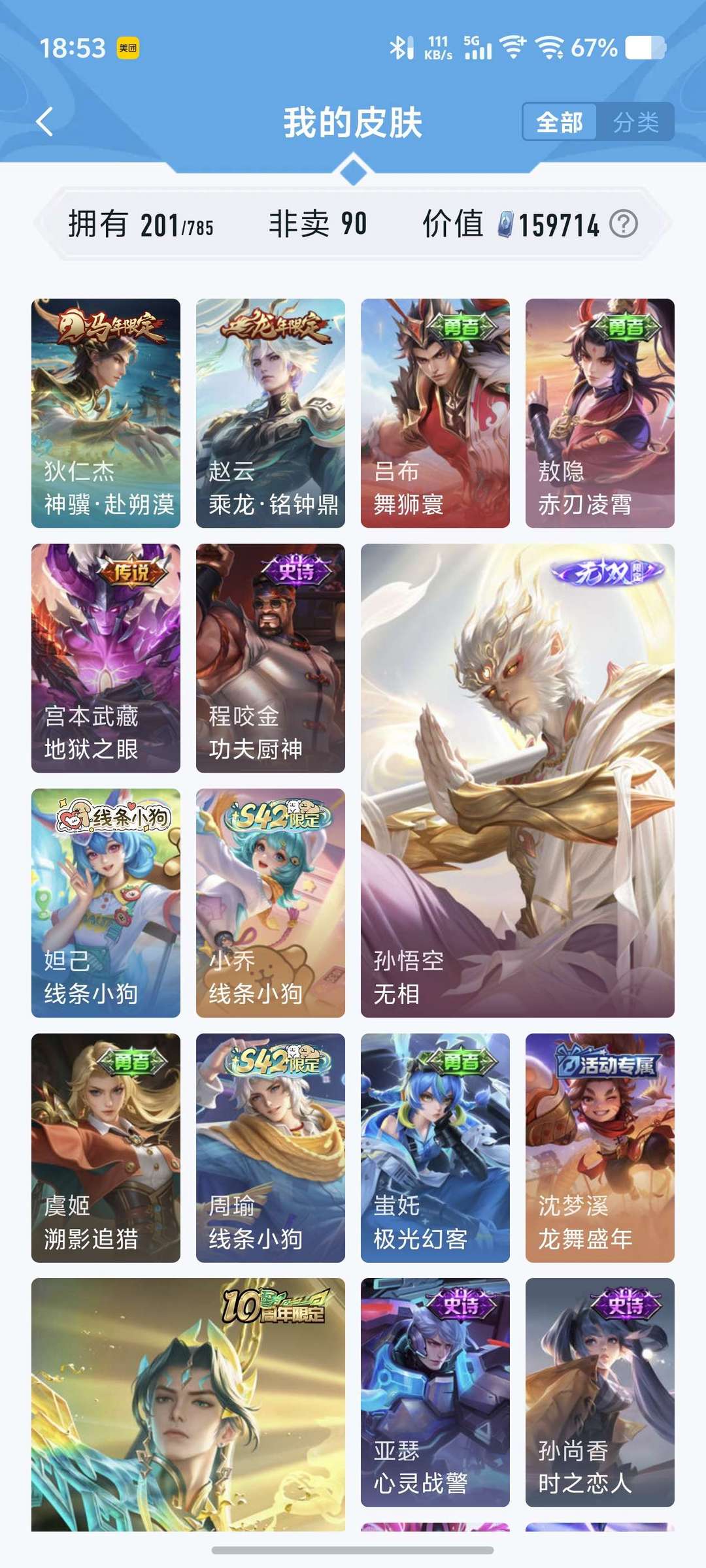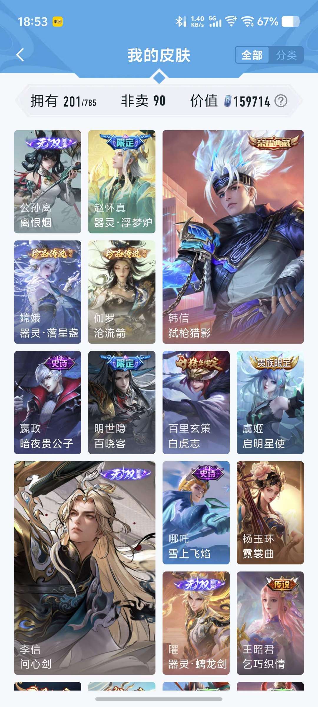 装备描述:百星,四无双李信无双,曜无双,猴子无双,阿离无双。韩信典藏,主玩发育路对抗路和打野