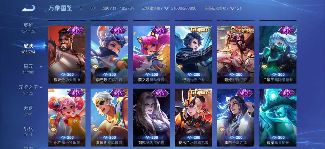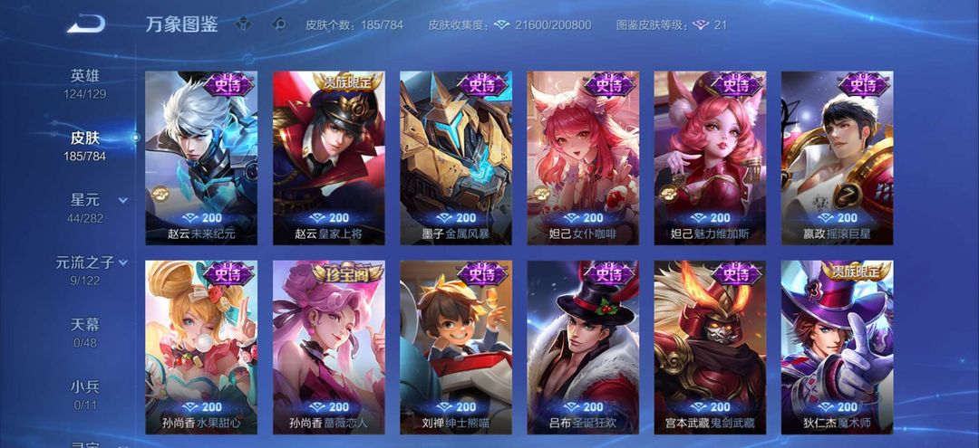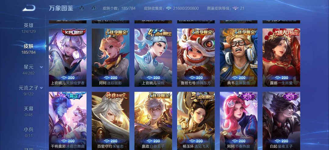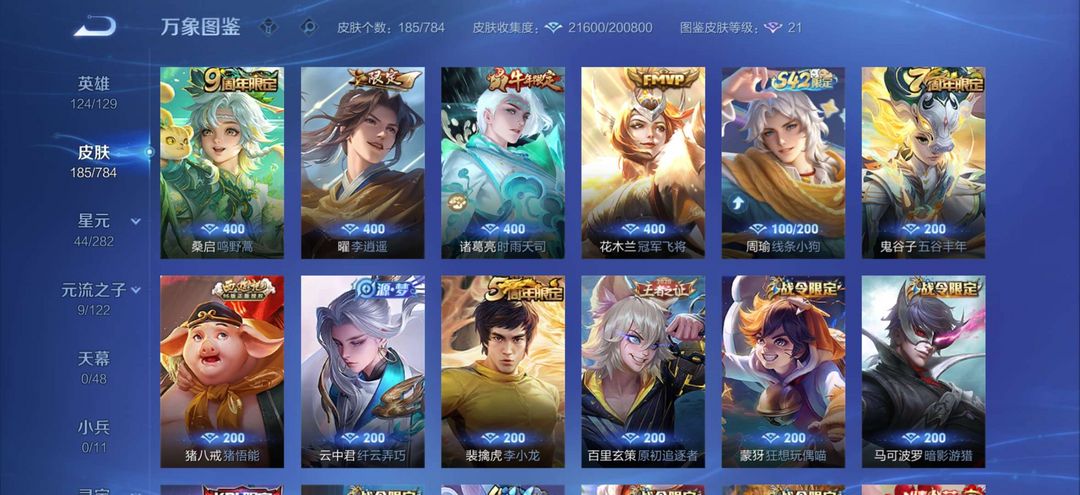 装备描述:皮肤 耀李逍遥,花木兰冠军飞将,守约朱雀,诸葛亮牛年,上官fmvp