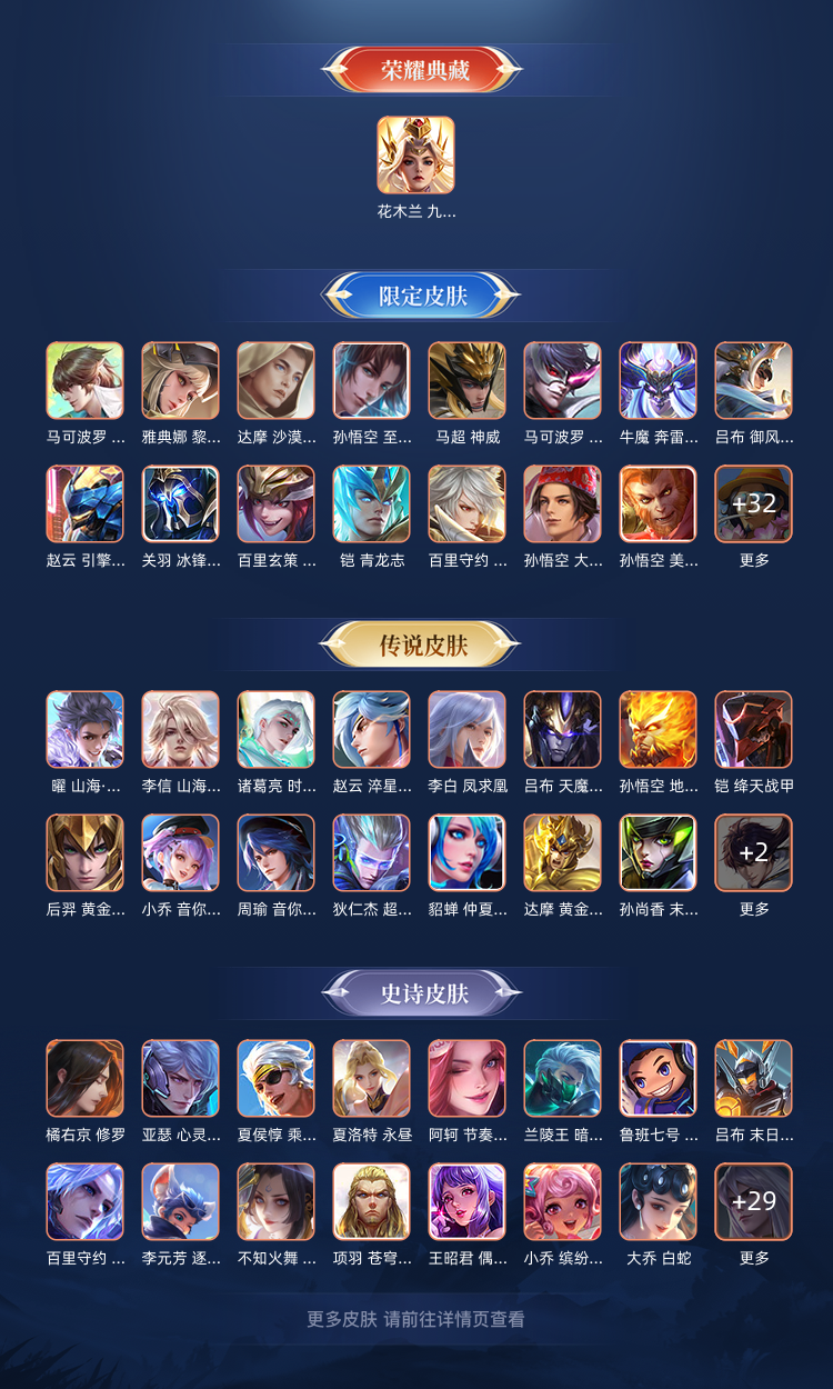 限定皮肤 传说皮肤 都有几十款 基本上每一个英雄都有皮肤