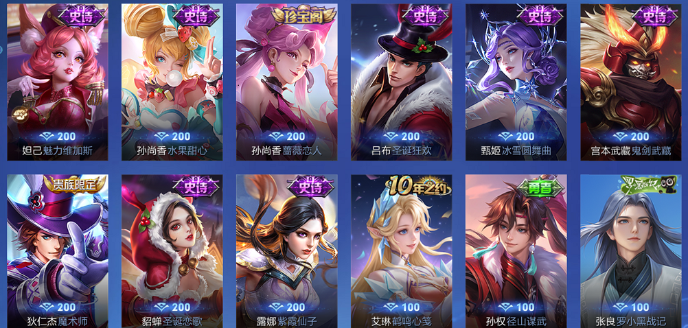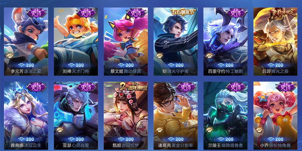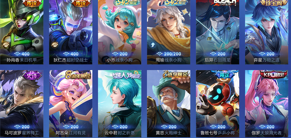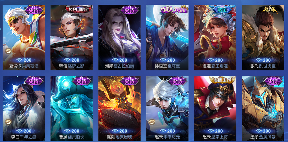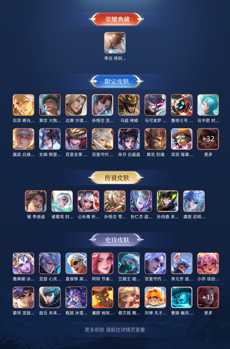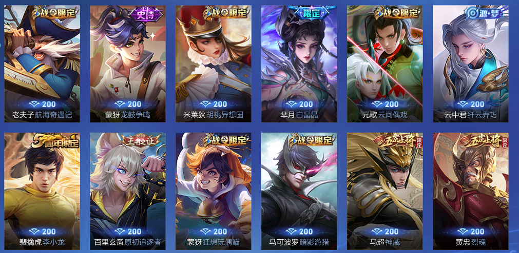 裴擒虎-天狼狩猎,李白典藏,耀-李逍遥,诸葛亮-时雨天师,虞姬-霸王别姬,韩信-逐梦之影,神威-马超