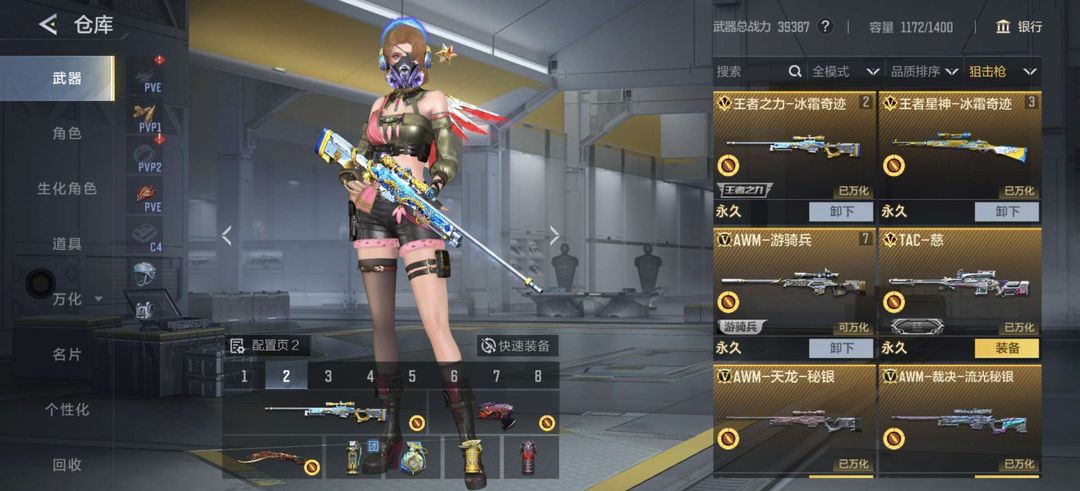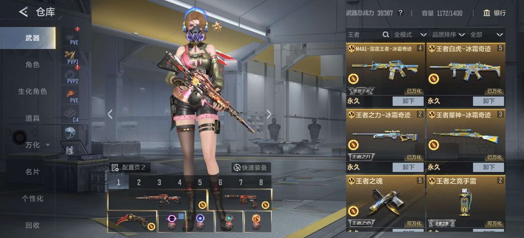 装备描述:v7精品爆破号,Kd.1.87,王力+冰皮, 王者白虎+音效卡+冰皮, 王者星神+音效卡+冰皮,m4A1-雷霆王者+冰皮,王心,王魂,仲达,仲达手枪,聚变脉冲套,聚变脉冲手雷套,cop堕天神,cop雷霆,cop云龙两把+音效卡×2,awm游骑兵,Tac-慈,幻神,竞技荣光套装