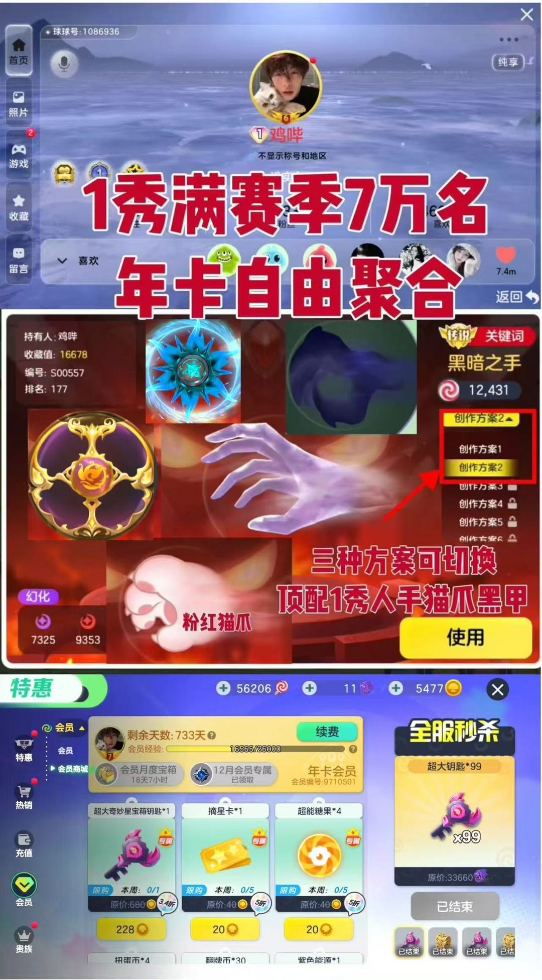 顶配1秀人手猫爪三方案❤满赛季7万名❤幻化黑甲壳虫❤3年年卡幻化大飞刃❤黑暗之手
