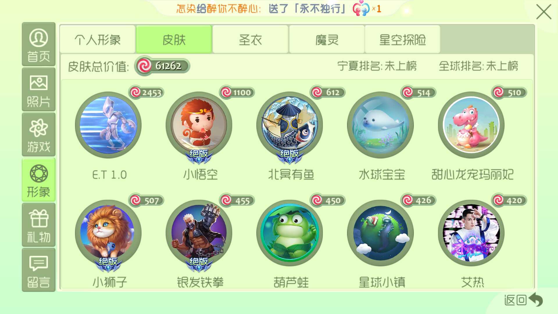 装备描述:以下介绍的光环孢子均为绝版 光环:游泳小黄鸭,夜光蘑菇,激战,松贺新年,天使荣光,星的思念,回旋镖,步步生莲,洛洛洛魔法阵,星月仙雨.四季,心跳回忆,芭娜娜迷幻之音,冬季恋歌,银魂,烈焰日珥……等等 孢子:迷你天王星,橘子舟,甜甜圈,太阳蛋宝宝,肉粽君,来福,大喵,雪乡天空,月亮先生,哈瑞,忧郁的丑小鲸,蓝色雨,巧克力糖,迷之舞步,升空热气球,呵,汪……等等 头饰:小木马,趴趴小熊猫,星月仙语,云舟,欢乐四周年,钓鱼……等等 残影:小鱼儿,星月仙语,星河,捕光风铃……等等 炫光:一飞冲天,奥斯卡的凝视,魂,流星雨,追我呀,抠脚,生气,吐,拉风依旧,我回来了,高兴,yes!,吞了你,嗨起来,腻害,佩服……等等 关键词有很多就不一一介绍了,可以租了后细细观看。