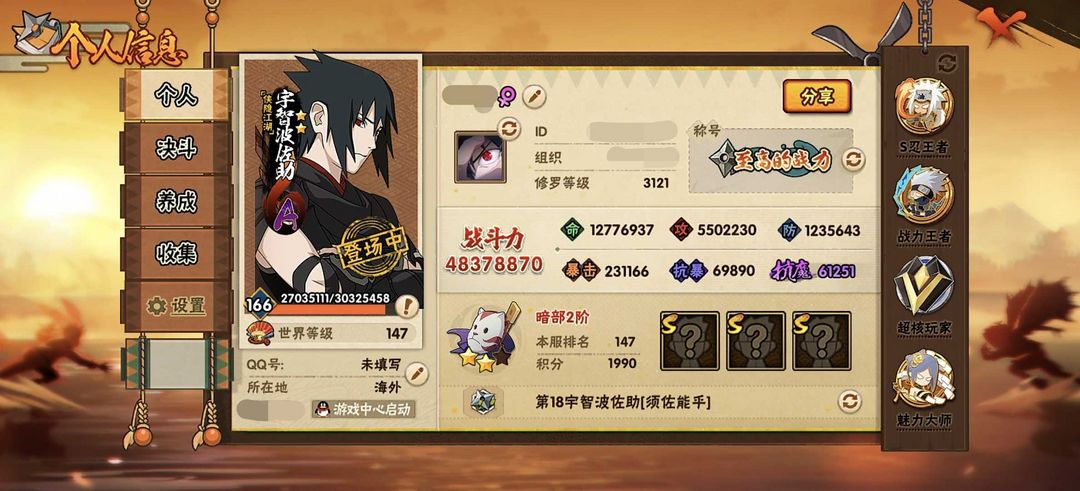 5000w战力全服榜黑绝五影会谈斑侠隐佐助漂泊带土九喇嘛水门六尾鸣人全忍者全通灵全奥义3000+属攻