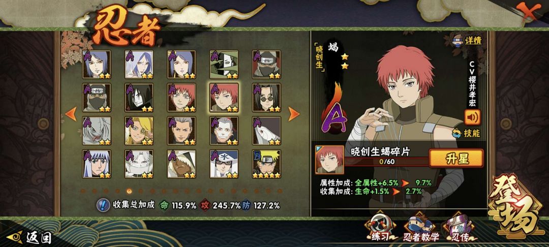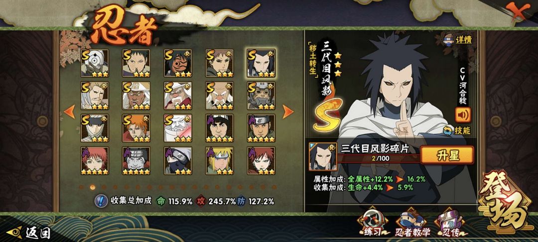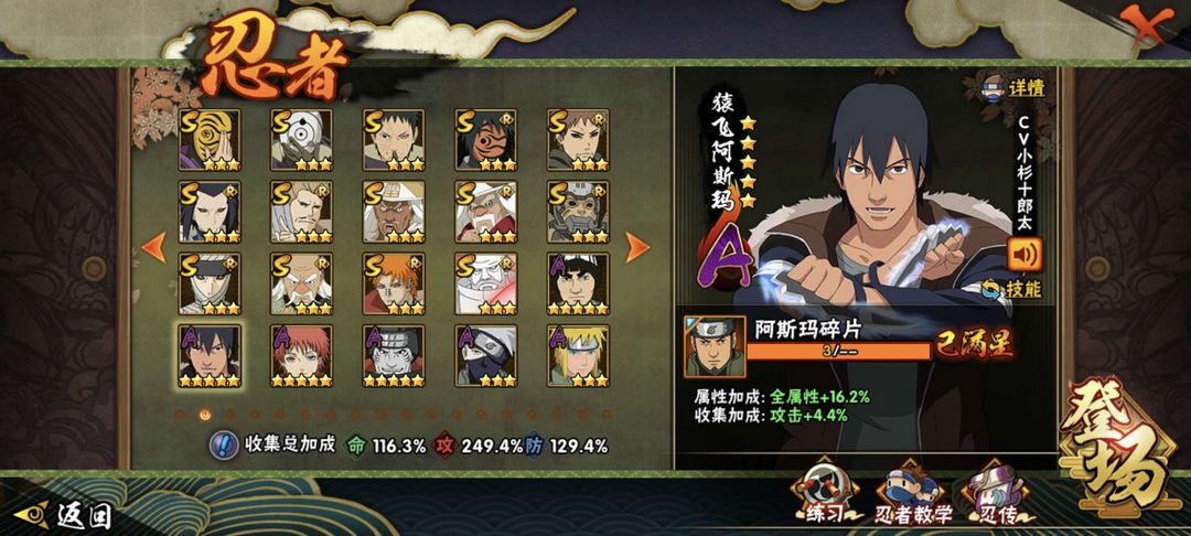 装备描述:三代风影,秽土转生解斑,创立柱间,永恒万花筒佐助,忍战带土,白面具,天道超,九喇嘛呜人,死门凯,秽土鼬,须佐鼬,神秘面具男,秽土柱间,扉间,秽土水门,柱间,秽土日斩,四代风影,创立斑,秽土半藏,二代土影,仙人自来也,二代水影,大野木,忍战大野木,四代雷影,红夜带土,忍战樱,金式 漂泊小南,漂泊佩恩,漂泊二代,忍战凯,暴怒带土,咒印佐助,漂泊再不斩,面麻,新春小南,新春水门,新春止水,新春鼬,恶灵飞段,青年三船,元气夏日卡卡西,爱情哥,卑留呼,百机蝎,惊门凯,新春迪达拉,侠隐照美冥,新春照美冥,侠隐纲手,忍战卡卡西,泳装小南,忍战天天,三船,新春我爱罗,绝,鲛肌融合,晓创生蝎