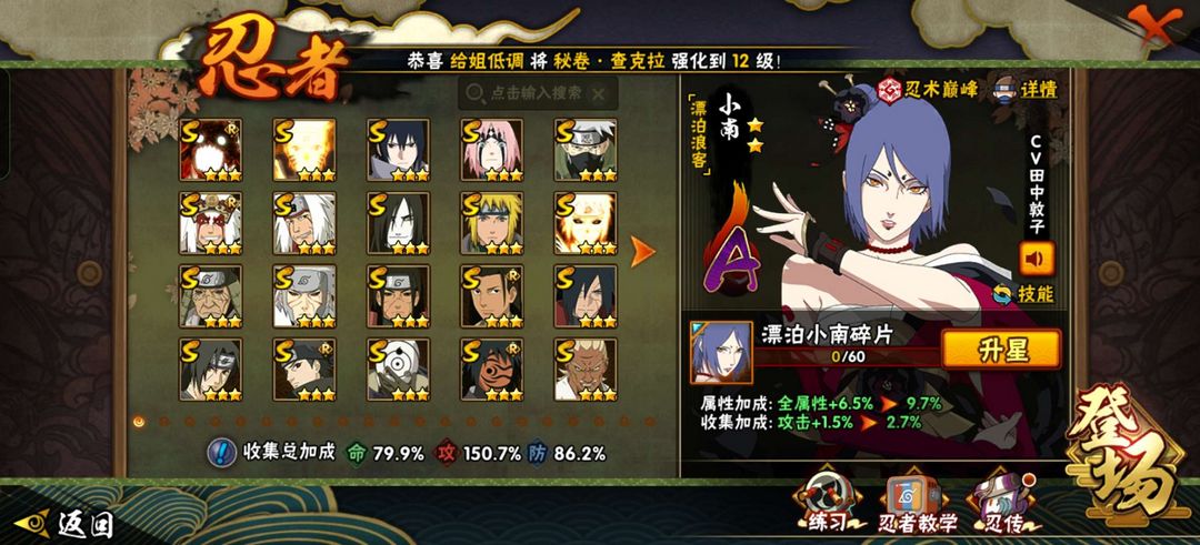装备描述:24s,40A红叶以后全忍法帖,漂泊小南漂带新南暴怒带土 ,98通灵有熊猫,1200w战力以上,可打段位赛练忍者