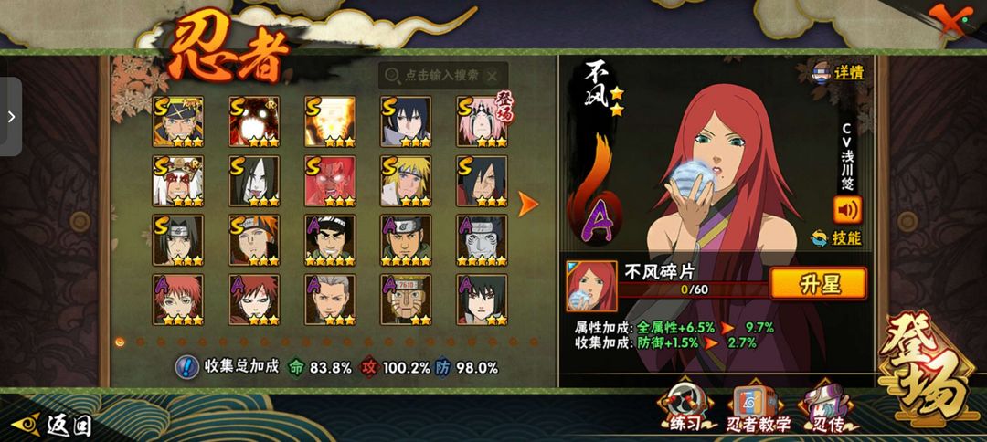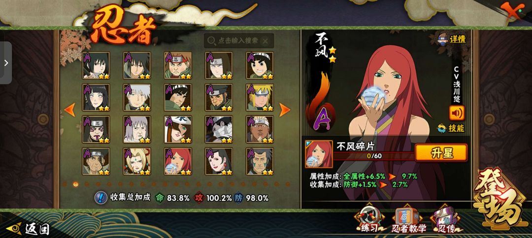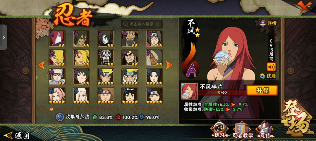 装备描述:六尾鸣人,九喇叭鸣人,永恒佐助,忍战小樱,死门凯,解班,鹰佐,须佐佐助,死迪,比缘,不凤,不动,妖怪纲手,晓蛇,神农
