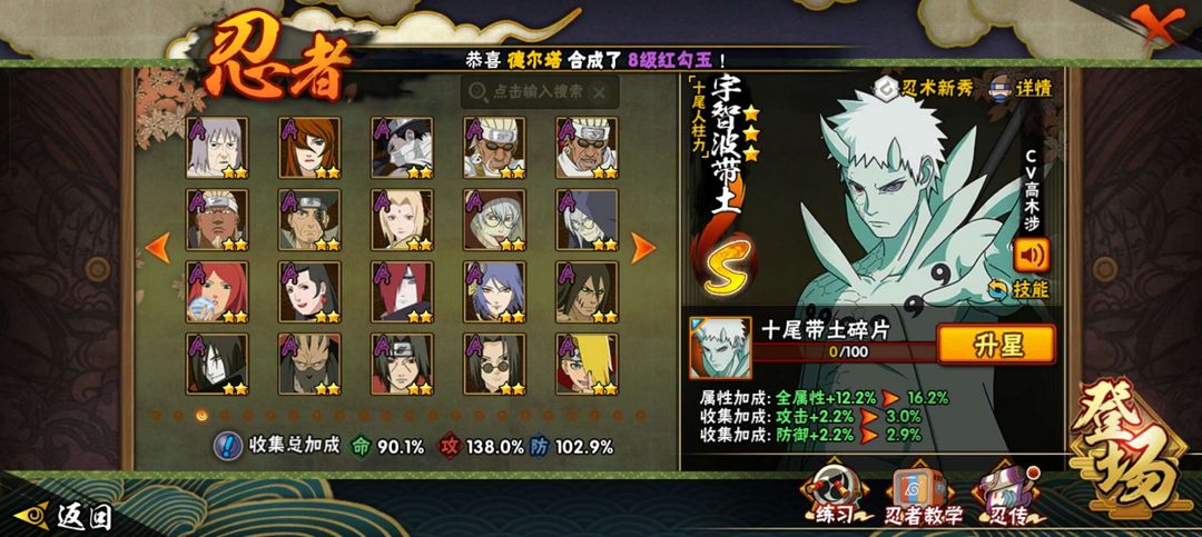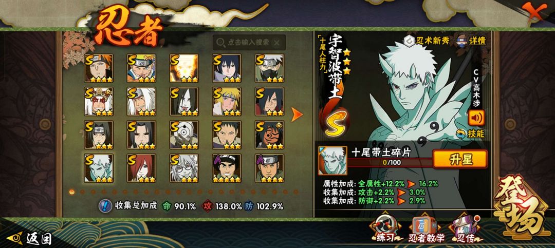 装备描述:18S,54A,223忍,十带,忍战带土,仙人兜,解斑,漂泊带土,熊猫,蛞蝓,侠隐兜,七夕阿斯玛,长门,新春鼬,须佐卡卡西,忍战卡卡西