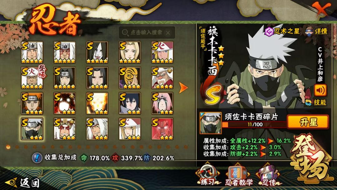 装备描述:53S✱3000万✱九喇嘛水门✱舍人✱须须佐卡卡西✱九喇嘛鸣人✱忍战带土✱佩恩超✱全忍者