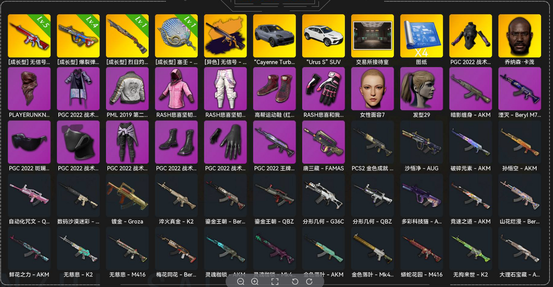 二级199199√5级异色无信号M416√保时捷跑车√兰博基尼√4级爆裂AUG√黑鬼发光手臂√丸子头