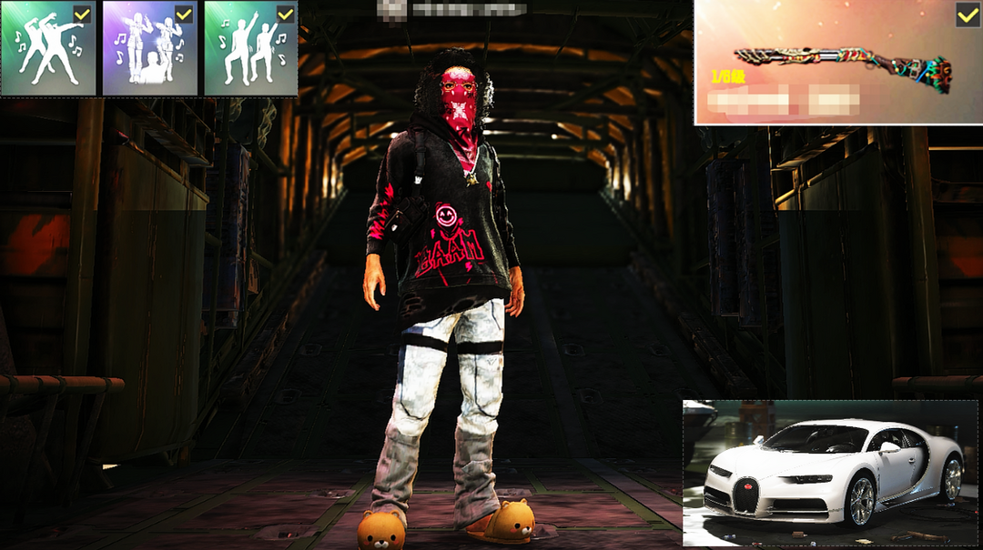 装备描述:二级密码112233可排位/布加迪联名跑车【成长武器-烈日灼烧S1897】发光套/黑熊套/麻辣小龙虾套/小胡子/