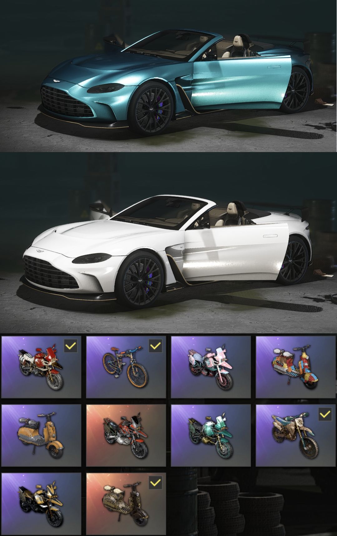 装备描述:【十二神器】满级午夜惊魂-Kar98k/满级异色圣诞AK/满级无重力MP5K/魔咒之力MK12/幽影残魂AWM/妖魔之触ACE32/时光之农SKS/无信号M416/紫色烟枪/翡翠色烟雾弹/品红色烟雾弹/双色阿斯顿马丁跑车/黑头/王者风衣/危险玩偶大礼包/蒸汽朋克大礼包/西游记套装/白熊套装/PGC2022大礼包 之舞143/144/145/146