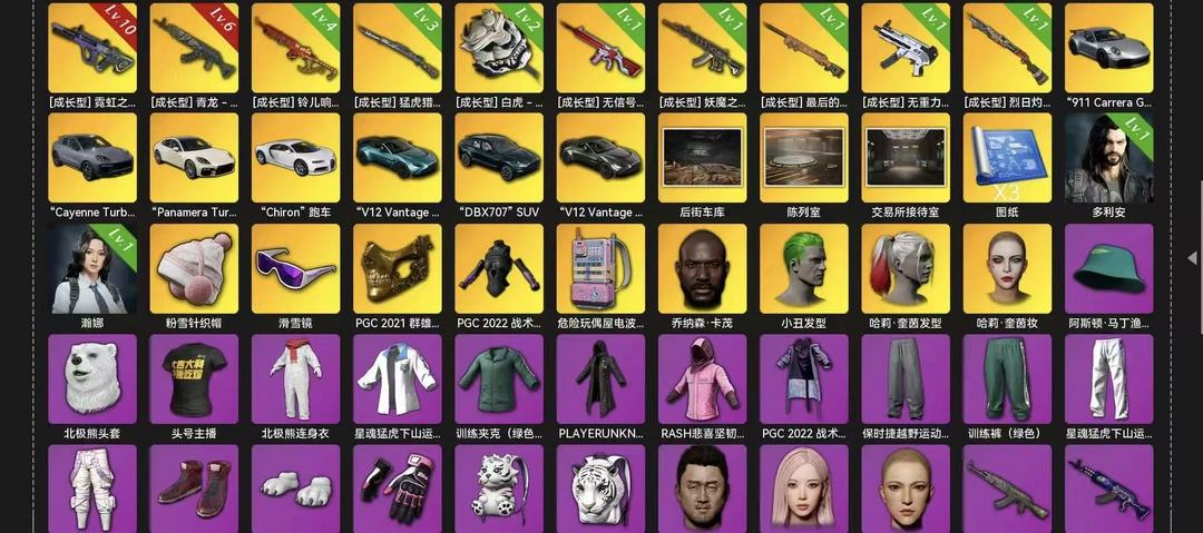 装备描述:大厅 :后街车库,陈列室,交易所接待室 【成长武器】[成长型] 妖魔之触 - ACE32[1级],[成长型] 铃儿响叮当 - Mini14[4级],[成长型] 无重力 - MP5K[1级],[成长型] 白虎 - 平底锅[2级],[成长型] 青龙 - Beryl M762[6级],[成长型] 猛虎猎手 - Kar98k[3级],[成长型] 烈日灼烧 - S1897[1级],[成长型] 霓虹之梦 - AUG[10级],[成长型] 最后的小夜曲 - M24[1级],[成长型] 无信号 - M416[1级] 【外观】小丑妆,青年谢尔盖,发型56,绯红新星的妆容,邓肯·斯莱德,萨迪娅·库雷希,发型64,发型31,午夜祭典妆容,女性面容7,哈莉·奎茵妆,朱莉·斯科尔斯,萨迪娅的头纱,乔纳森·卡茂,哈莉·奎茵发型,万寿菊狂欢妆容,亡灵律动妆容,末世面容,小丑发型,马先生,aespa GISELLE - 面容 【竞争者】多利安, 瀚娜
