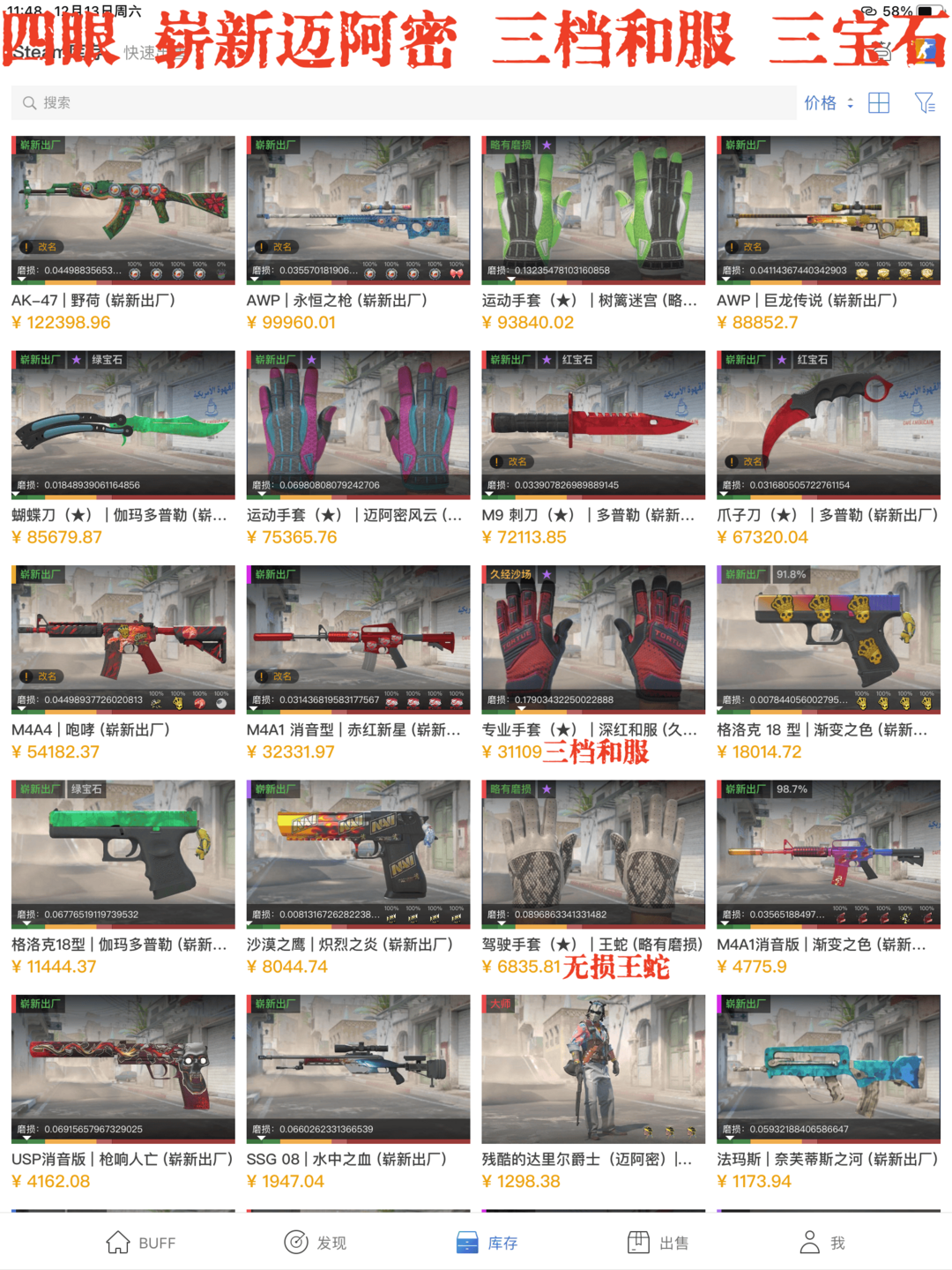 看账号描述【程程】崭新迈阿密 全息小眼野荷永恒龙狙 略磨树篱三档和服 崭新咆哮 丝斑绿宝蝴蝶 红宝M
