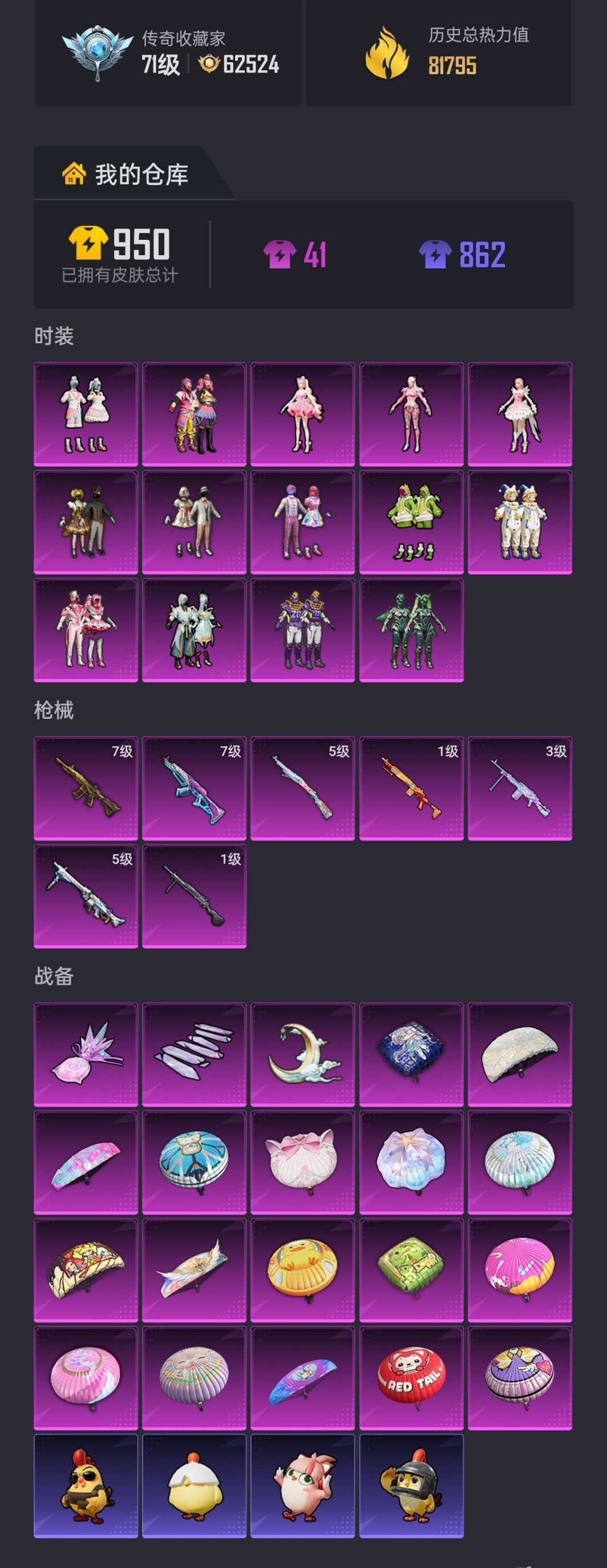 限制: 租号10次及以上 |装备描述:禁止开挂,禁止坐挂车,禁止骂人,禁止分解枪械等~谢谢宝宝们~ 套装196个,粉套17个, 枪皮222个,特效枪7个 装备363个,三级头50个,三级包57个 滑翔尾迹17个,僚机1个,伙伴9个,动作134个 祝您游戏愉快~