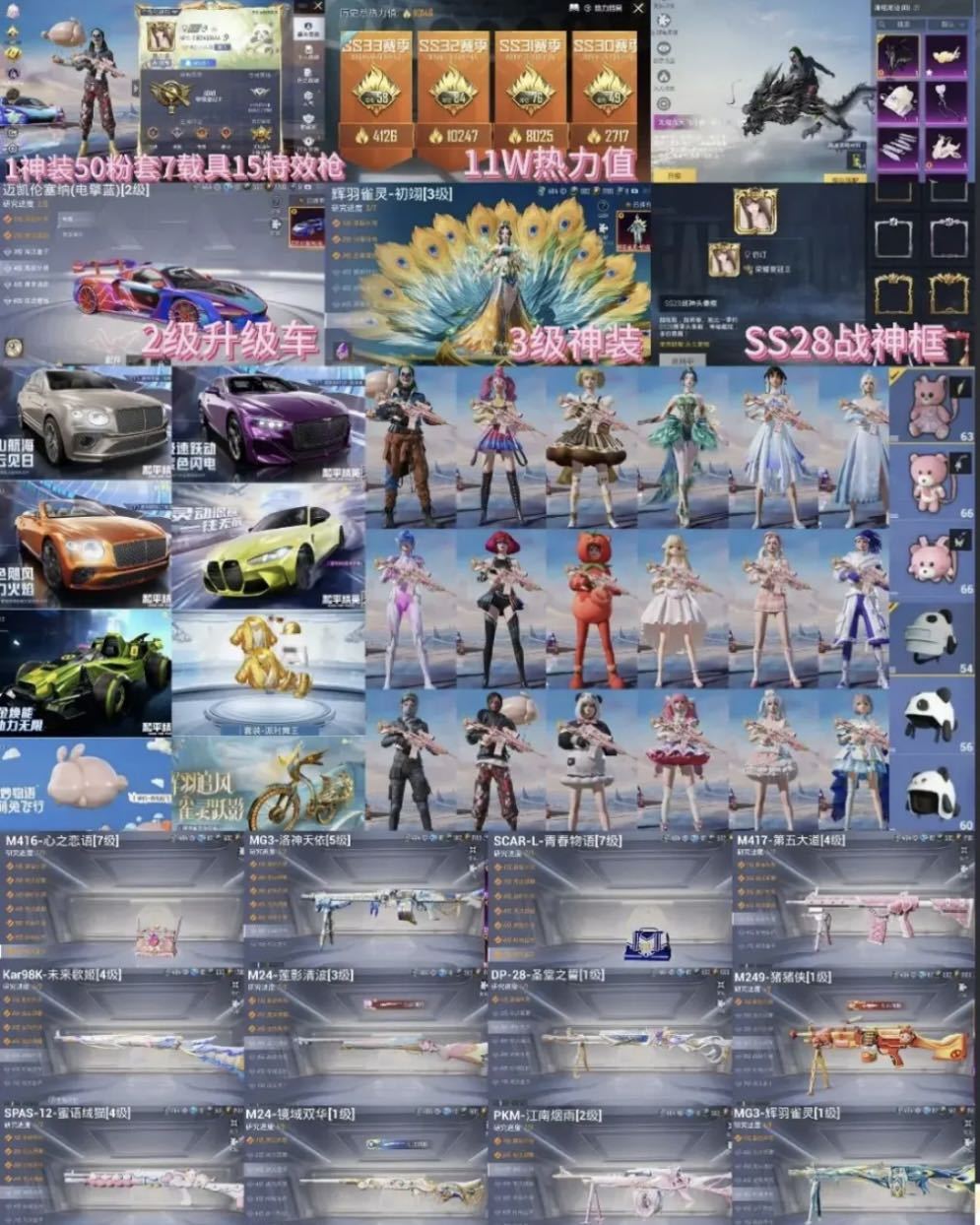 1神装50粉套7载具15特效枪3级初翊/2级迈凯伦塞纳/SS28战神框/小丑/雪国/猪妹/赵灵儿/