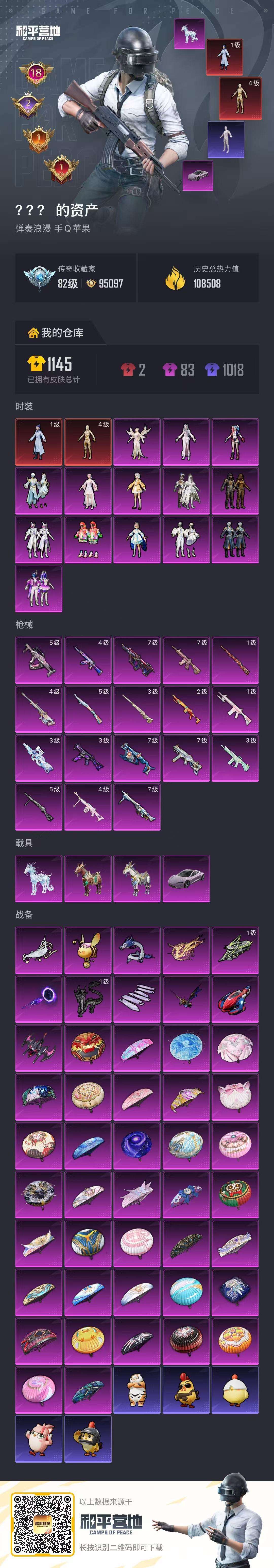 装备描述:2红装,18特效枪,4载具,奇异狩猎者,木乃伊,小丑鱼,心之恋语