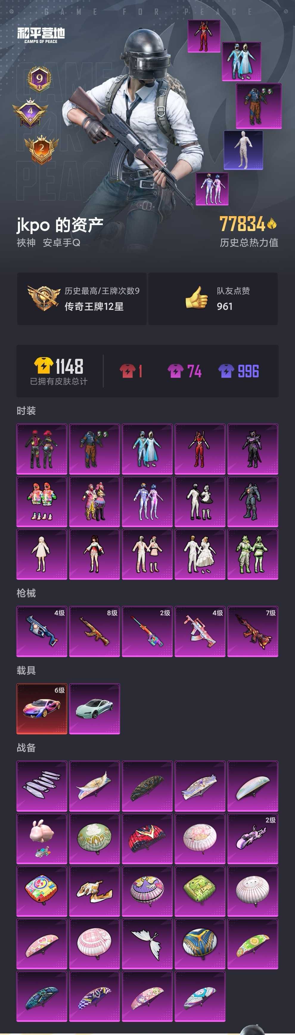 限制: 租号2次及以上 | 撤单率<25%才可租用此帐号装备描述:15粉,2载具,154套装,AKM-盖世英雄/M416-风花雪月/GROZA-旋转彩虹/AMR-炫光之旅/Vector-环太平洋/迈凯伦570S(镭射紫)/特斯拉Roadster(水滴蓝)/