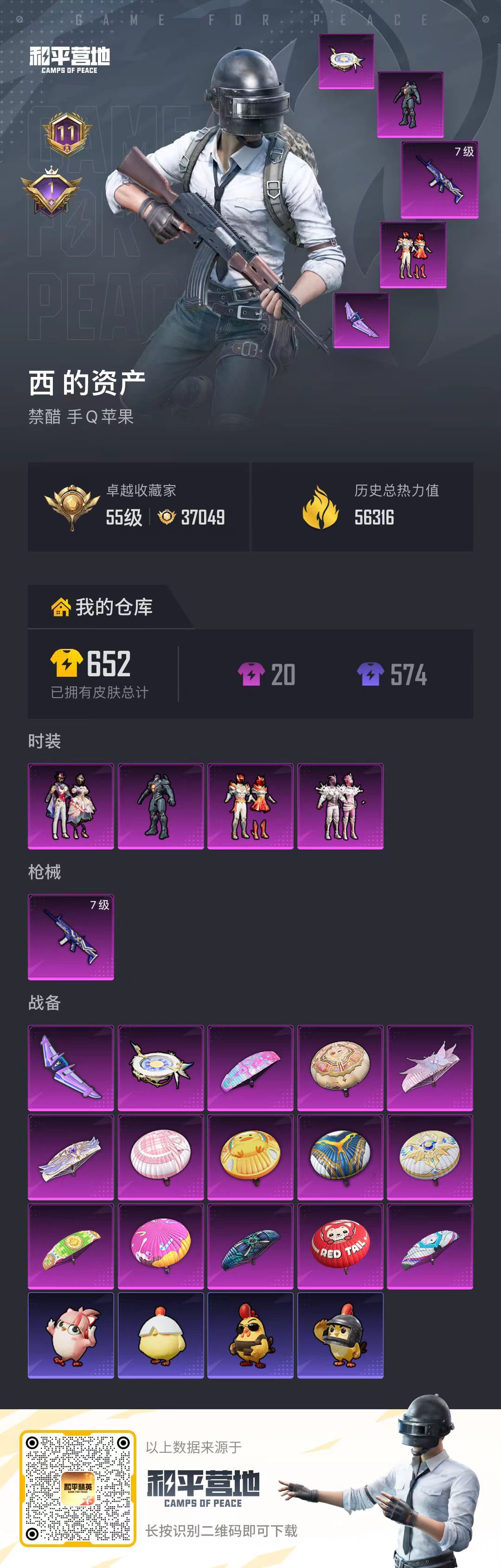 56316热力⭐652件皮肤⭐20粉装⭐1特效枪⭐GROZA-彩虹符号⭐M416-紫翼圣骑⭐