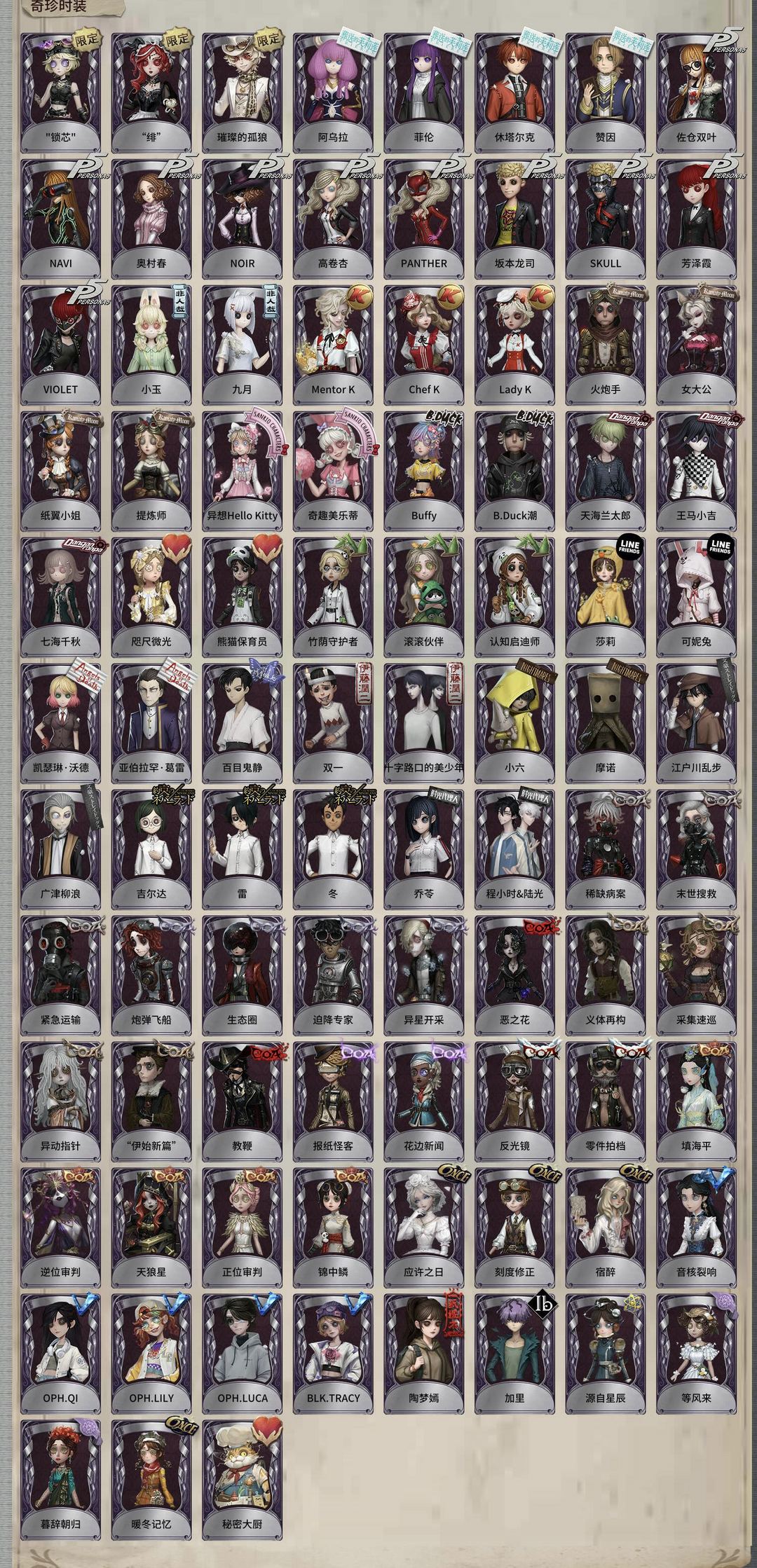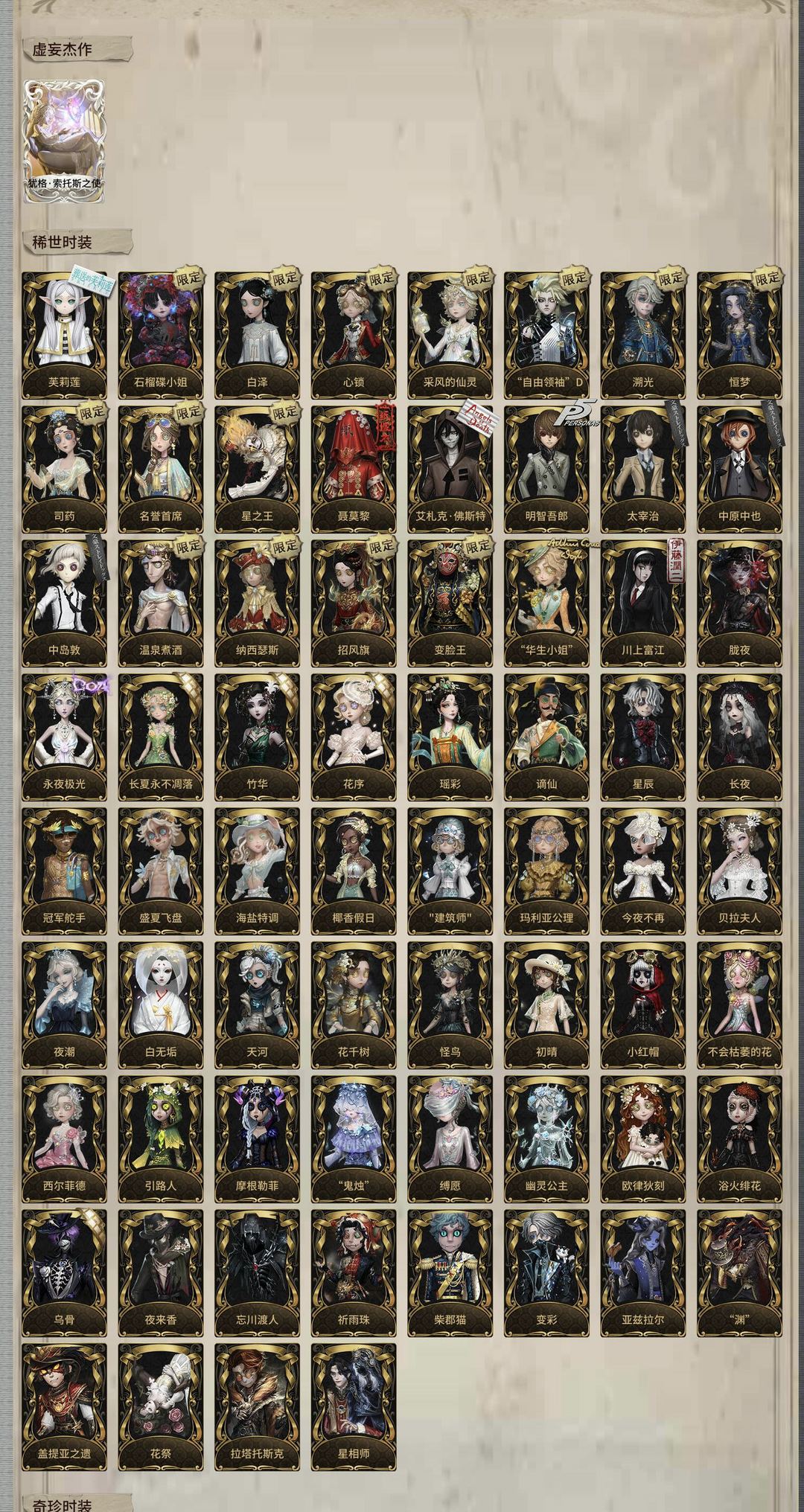 装备描述:祭司虚妄 芙莉莲全套 采风的仙灵 白泽 心锁 石榴碟小姐 恒梦 溯光 绯 锁芯 璀璨的孤狼 太宰治 中原中也 中岛敦 艾扎克 补了园丁的宁芙和溯洄,古董旺旺联名