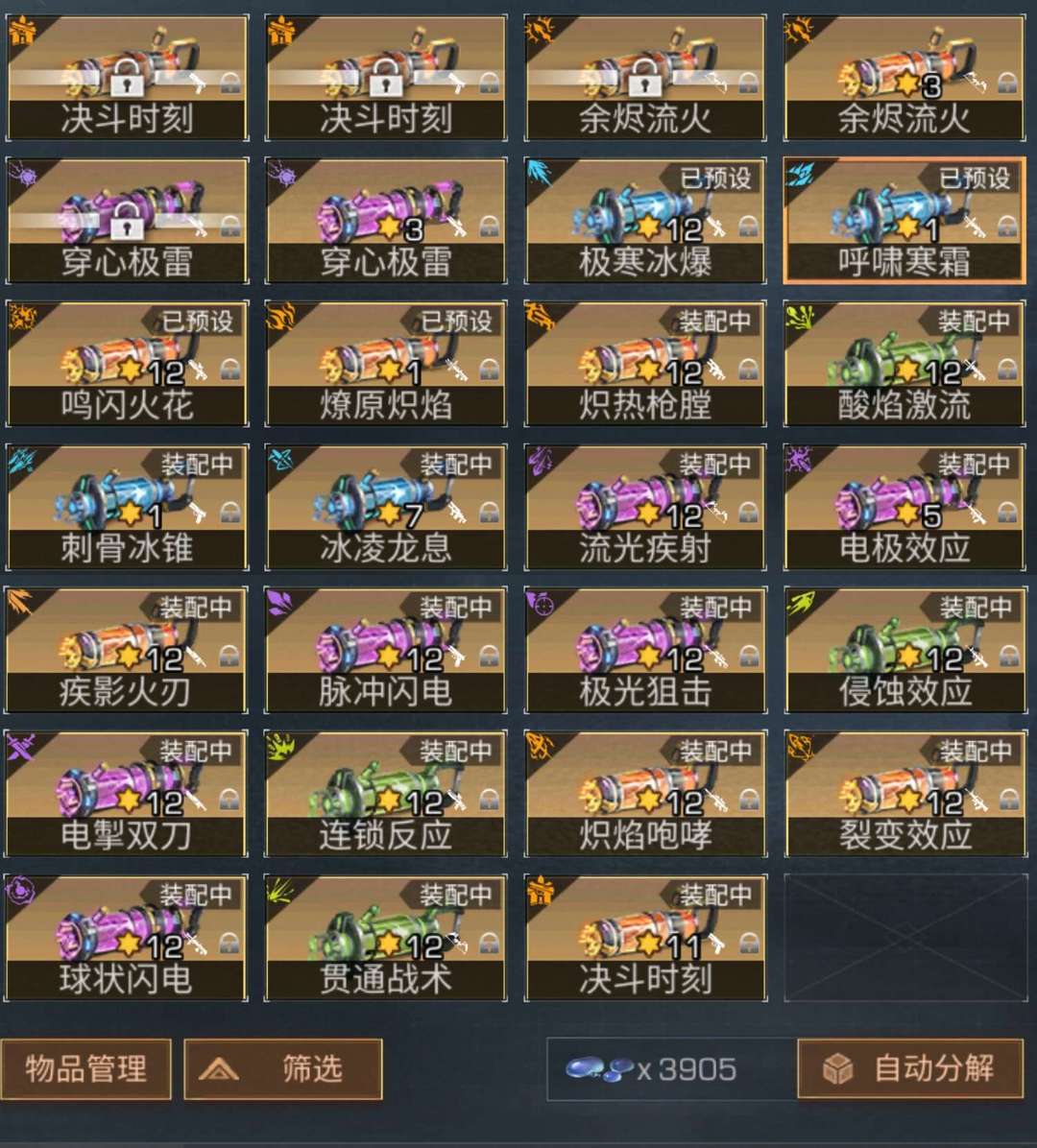 皇家步枪,30庄,27万魅力值,全9图12裂变12酸弓12酸喷12电球11决斗等全10进阶