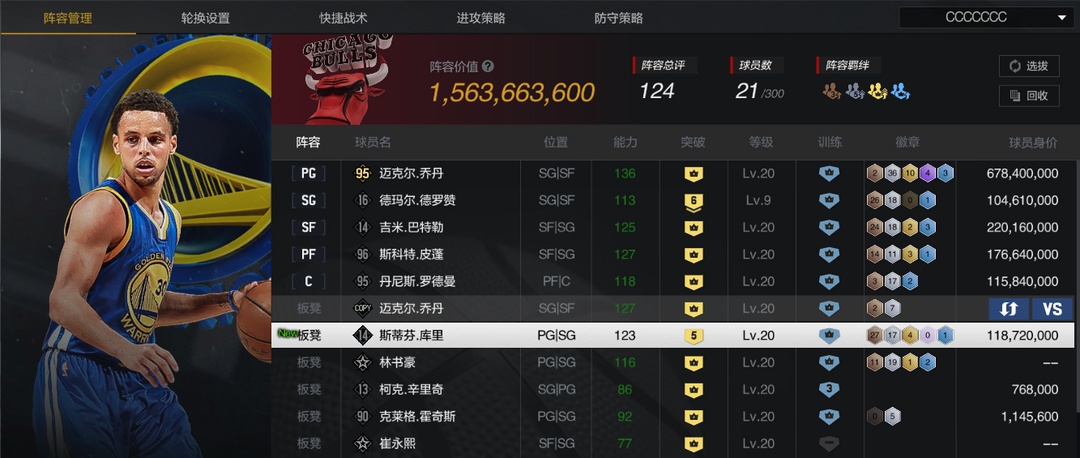 装备描述:【5陈列室库里】【巅峰公牛套】【10三时刻乔丹】【6时刻德罗赞】【10时刻巴特勒/皮蓬/罗德曼】